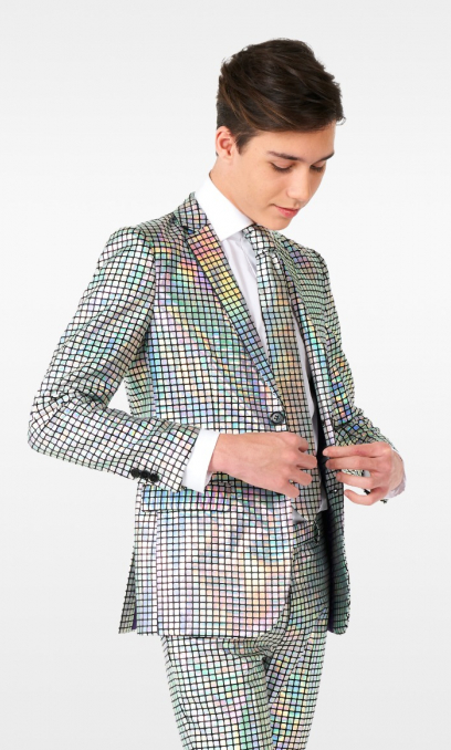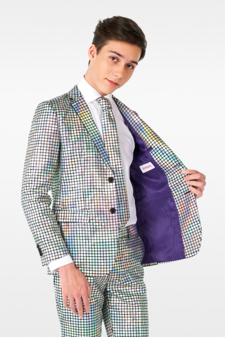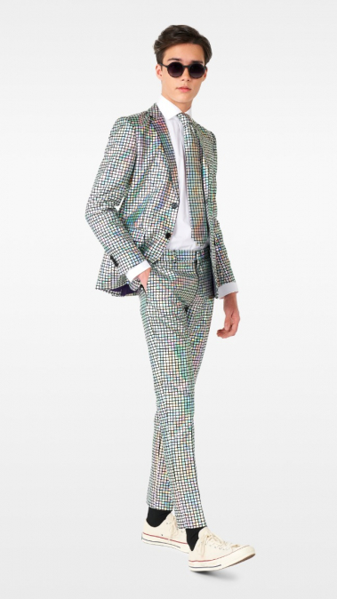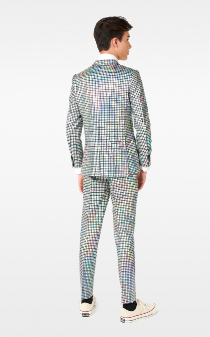 Denne fantastiske dragt med spejlblanke lapper er en sand publikumsfavorit. Har du de rette moves og rytmen til at bære den og danse til diskotekets lyd? Tag den på til din næste skoledans, og du vil få alle til at danse omkring dig hele natten lang.