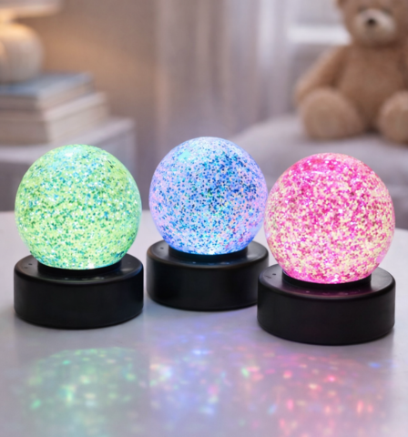 Den lille lampe lyser op i skiftende farver og giver en rolig og behagelig effekt – særligt i et mørkt rum, hvor glitteret virkelig kommer til sin ret. Perfekt som dekorativ lampe på værelset, i stuen eller som en lille stemningsskaber om aftenen.