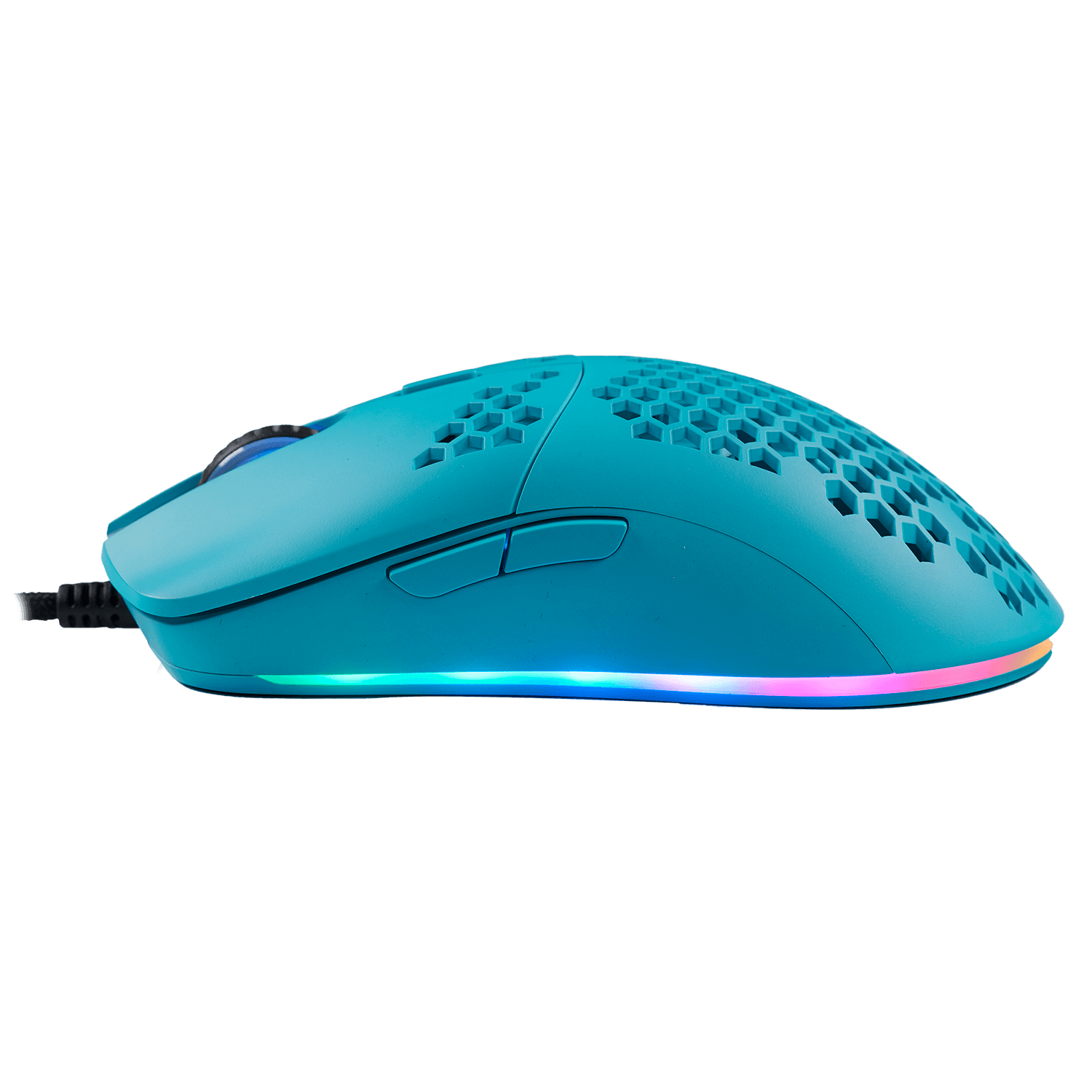 GM800 musen har et slidstærkt kabel og holdbare knapper, der kan modstå mange timers klik uden at miste præcision. Det ergonomiske design sikrer, at hånden hviler naturligt, hvilket mindsker træthed og øger din kontrol. Den flotte cyan farve giver et friskt pust til dit gaming-setup, samtidig med at musens overflade sikrer godt greb og stabilitet under brug.