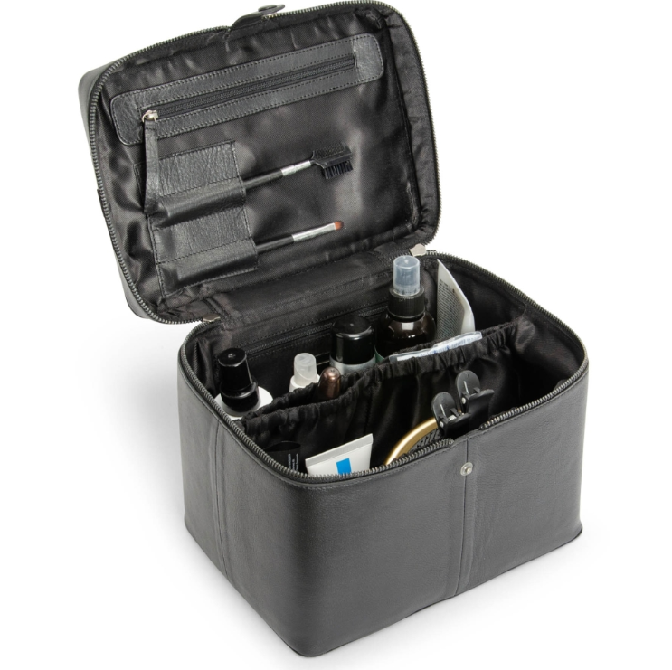 Lexi toilettasken er skabt med en gennemtænkt indretning, der gør det nemt at holde styr på dine ting. Den robuste læderkvalitet sikrer lang holdbarhed, mens den glatte overflade gør rengøringen enkel. Taskens lynlås sikrer, at indholdet bliver sikkert opbevaret, og den stilrene sorte farve passer til enhver stil og anledning.