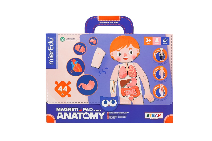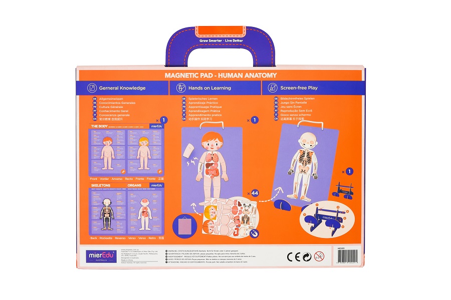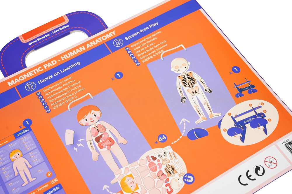 - Kreativ og sanselig leg: Børn kan placere de 44 magneter og lære om organer og kropsdele.