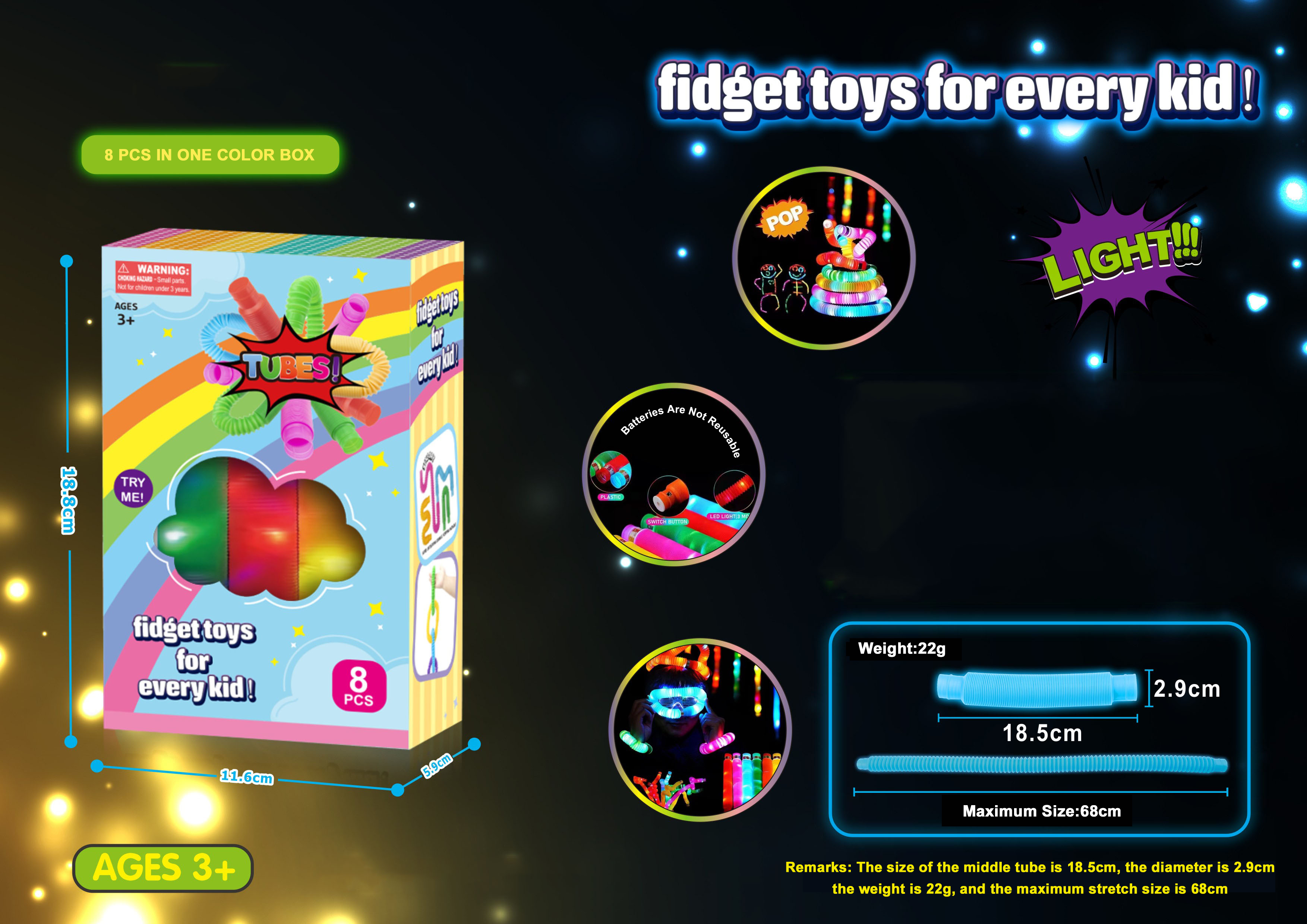 Specifikationer – Pop Flash Tube Fidget 8 stk.