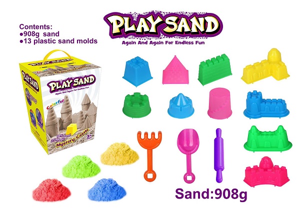 Indhold: 908 g kinetisk sand (4 farver), sandslotsforme og skovl.