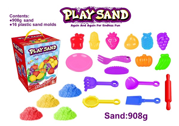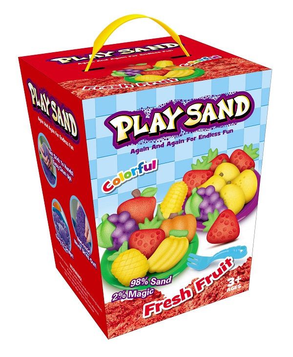 • Indhold: 908 g sand i 4 farver, frugtforme og skovl