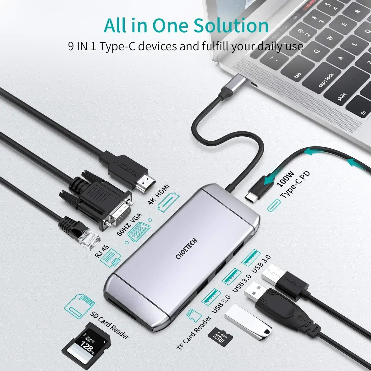 Choetech 9-i-1 USB-C Hub i grå – alsidig dockingstation med 4K HDMI og 100W PD