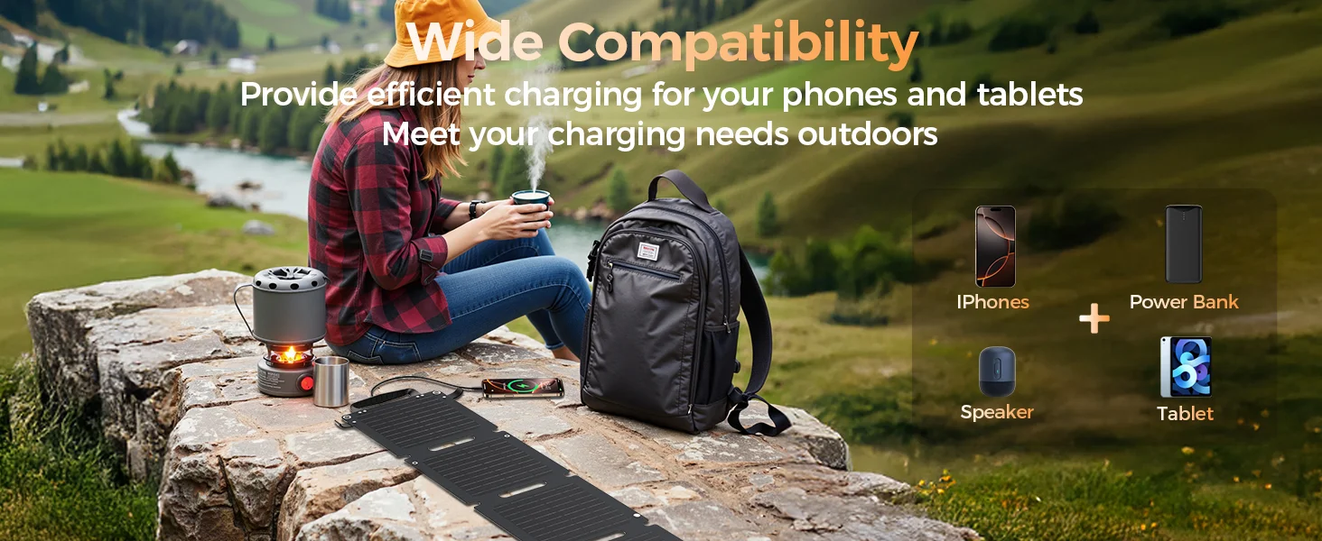 Solcellepanelet er designet med fokus på både holdbarhed og brugervenlighed. Den robuste konstruktion tåler udendørs brug, mens den kompakte og lette form gør det nemt at have med i rygsækken. De to USB-porte sikrer fleksibel opladning af flere enheder samtidig, og panelets høje effekt på 28W giver hurtig og stabil strømforsyning, selv på dage med mindre sollys.