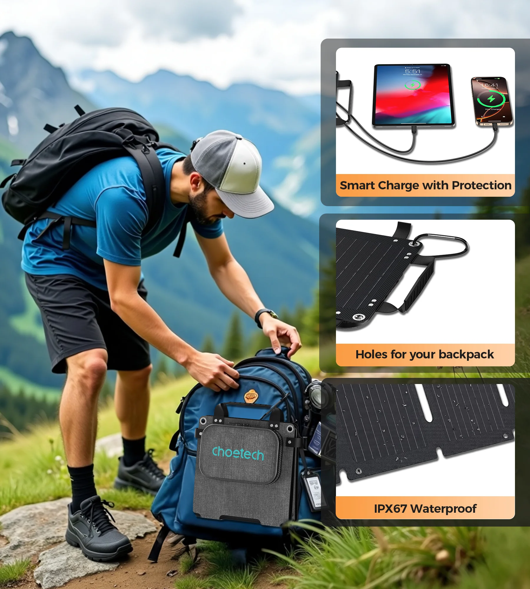Choetech solcellepanelet kombinerer praktisk funktion med et moderne look, så du altid har strøm, når du har brug for det – uanset hvor du befinder dig.