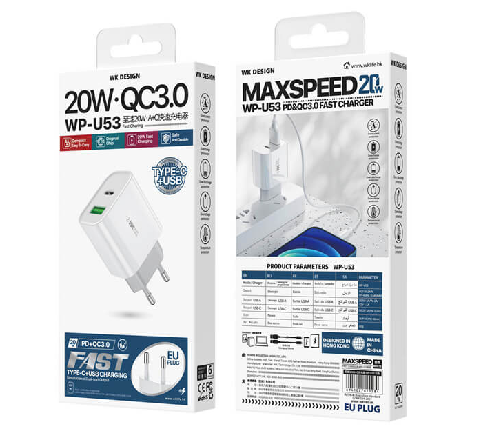 | Ekstra information | Input: AC110-240V / 47-63Hz 0.6A. Output: USB/Type C: DC5V-5.3A9V-2.22A. Output: USB A: DC 5V-3A/12V-1.5A/9V-2A. Max output 20W. USB+Type-C |