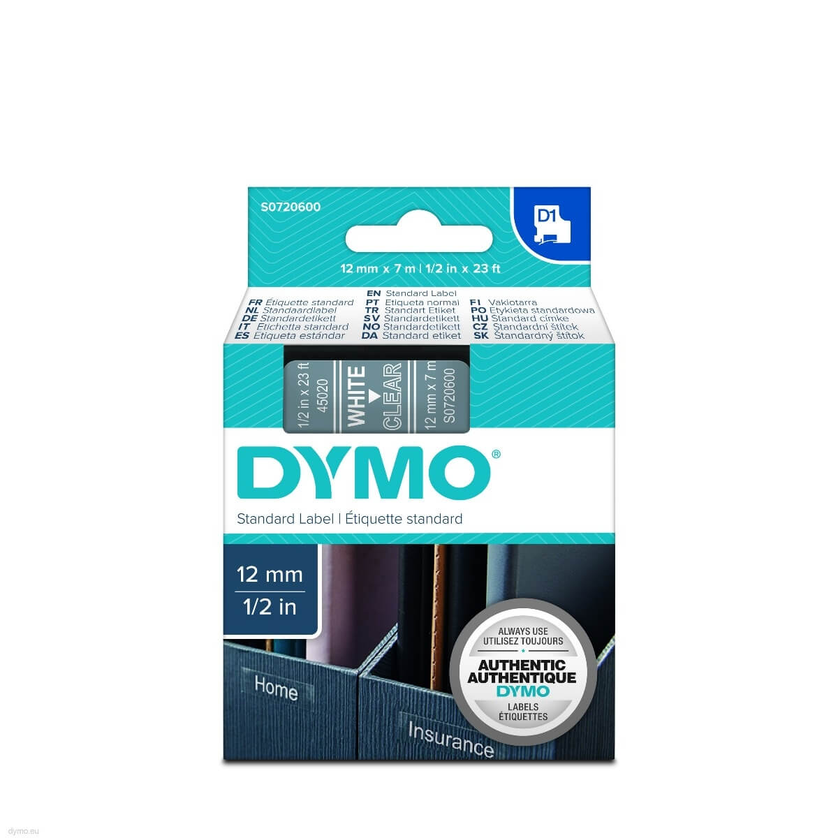 DYMO Tape D1 (45020) 12 mm (7 m) - hvid/klar til præcis mærkning