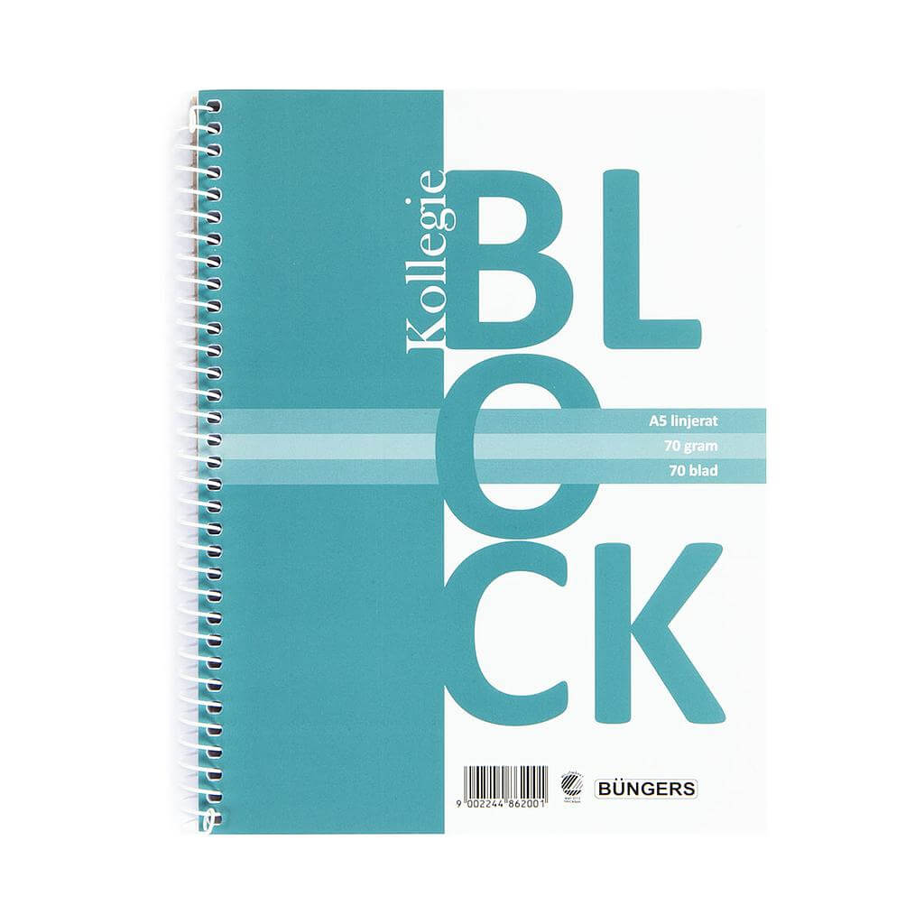 Ekstra information Büngers kollegieblok A5. 70 linjeret blade i 70 g Svanemærket hvidt papir. Perforering langs spiralsiden for nem afrivning.