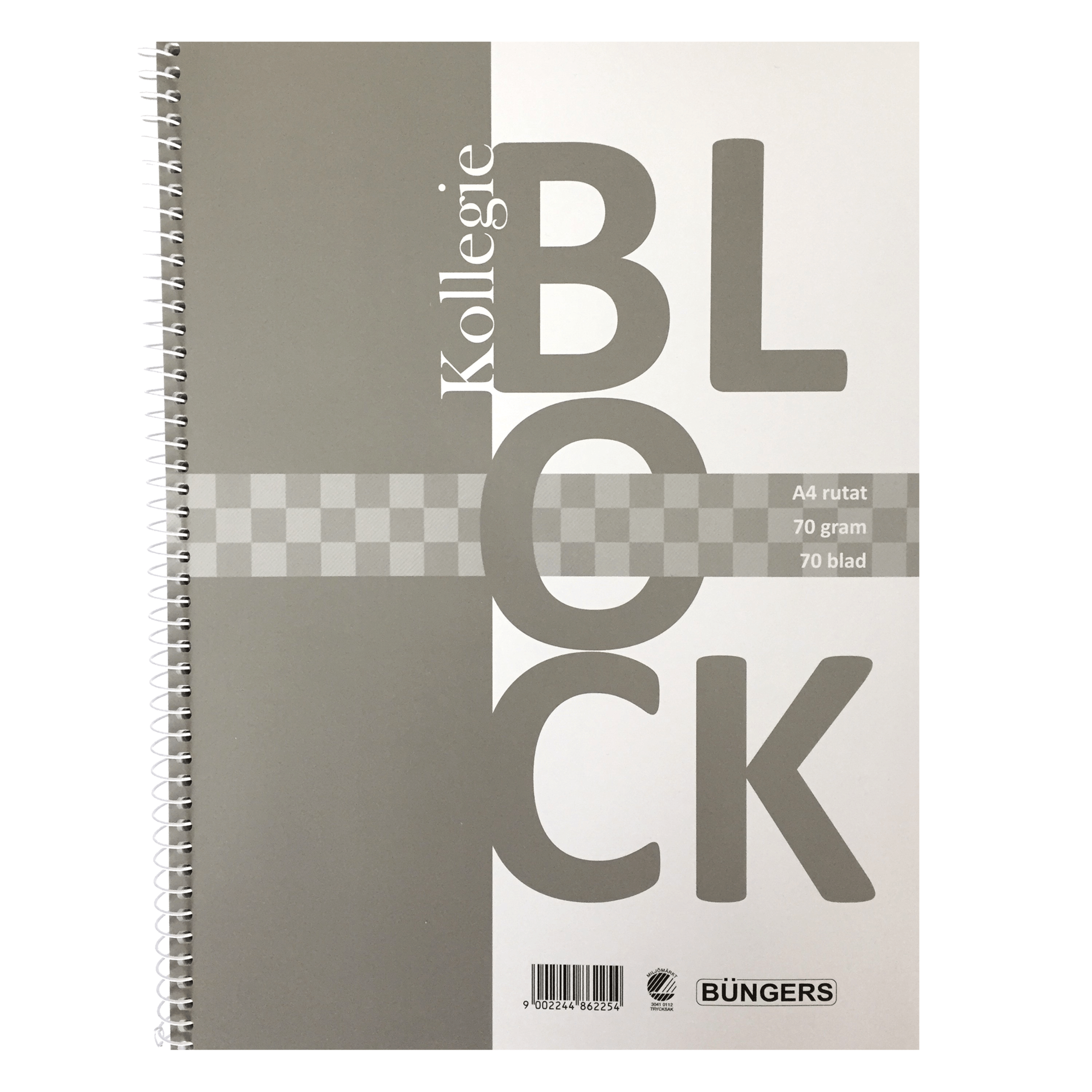 | Ekstra information | Büngers kollegieblok A4. 70 kvadreret blade i 70 g Svanemærket hvidt papir.Perforering langs spiralsiden for nem afrivning. |