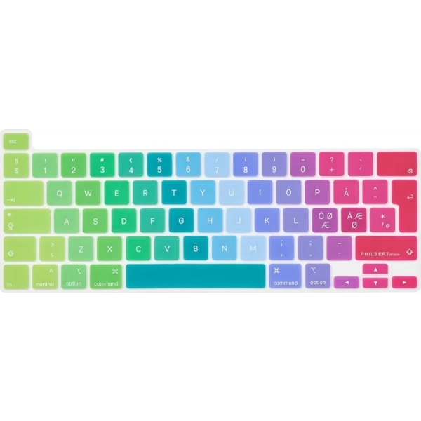 Giv din MacBook et frisk pust og samtidig den nødvendige beskyttelse med Philbert tastaturcoveret i regnbuefarver – et praktisk og dekorativt valg til din daglige computerbrug.