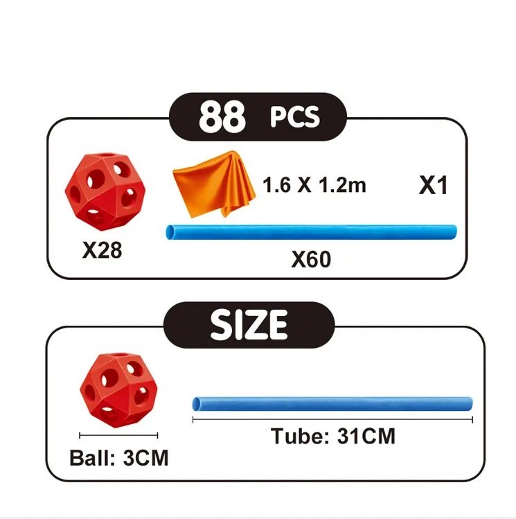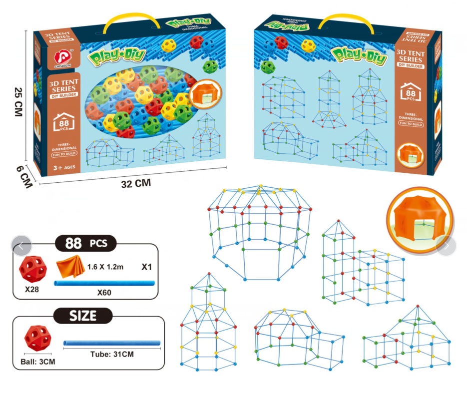 Slip kreativiteten løs med denne Byg-selv-hule med 88 dele, hvor børn kan bygge deres egne legehuler, tunneler, telte og tårne. Et sjovt sæt, der styrker fantasi, motorik og problemløsning, mens børnene leger indendørs eller udendørs.