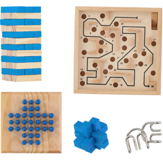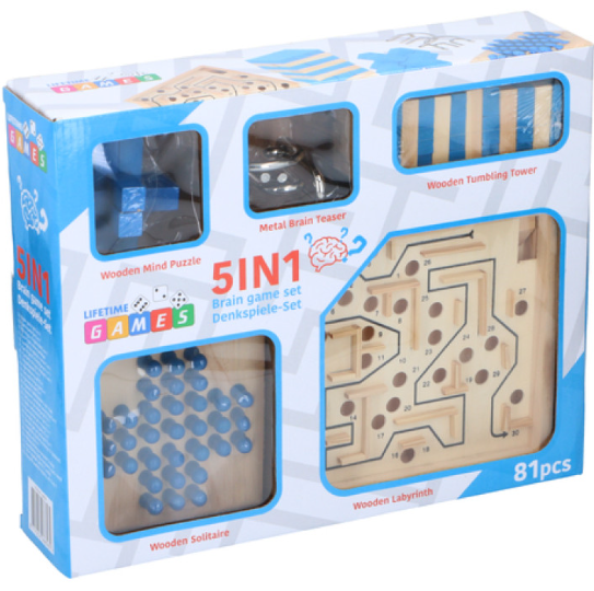 5 spil i 1: Indeholder labyrint, solitaire, tumbling tower, træpuslespil og metal brain teaser.