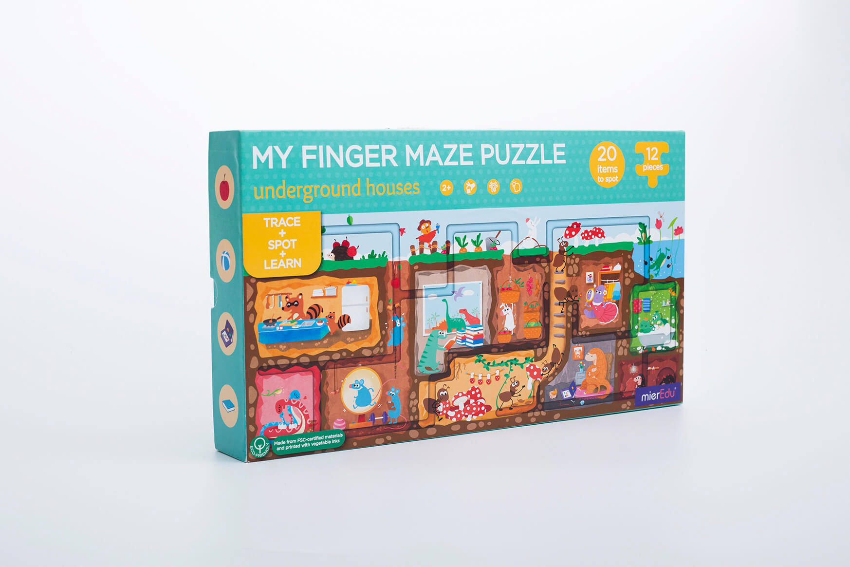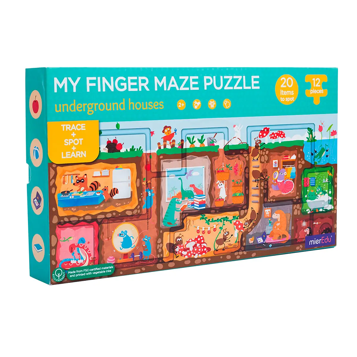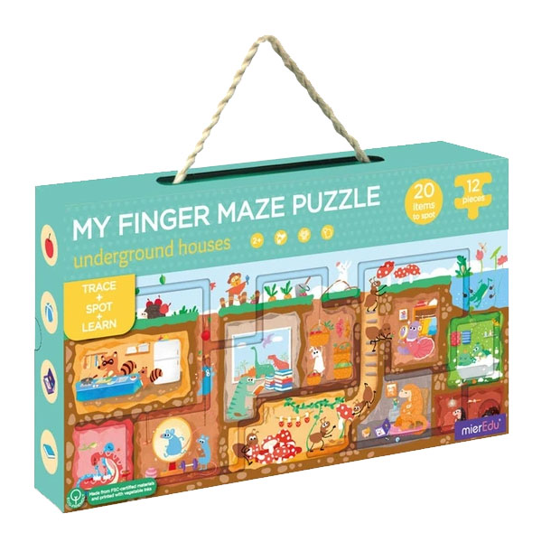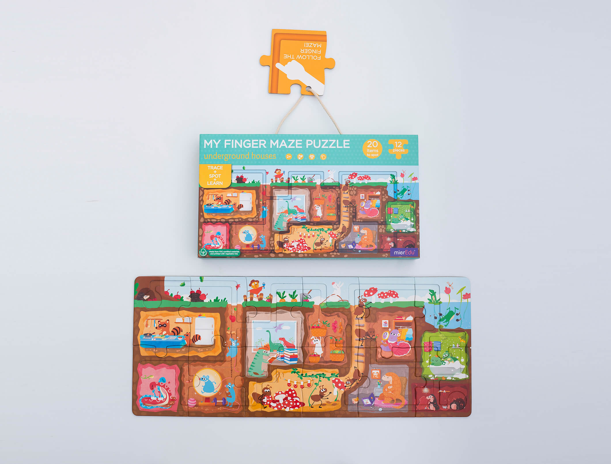 Giv dit barn sjov og læring med mierEdu Kreativt puslespil - Underground Houses, der kombinerer labyrintleg og find-og-søg-aktivitet. Barnet følger labyrinten med fingrene og finder 20 skjulte elementer undervejs, hvilket stimulerer sanser, motorik og kognitiv udvikling på en engagerende måde.