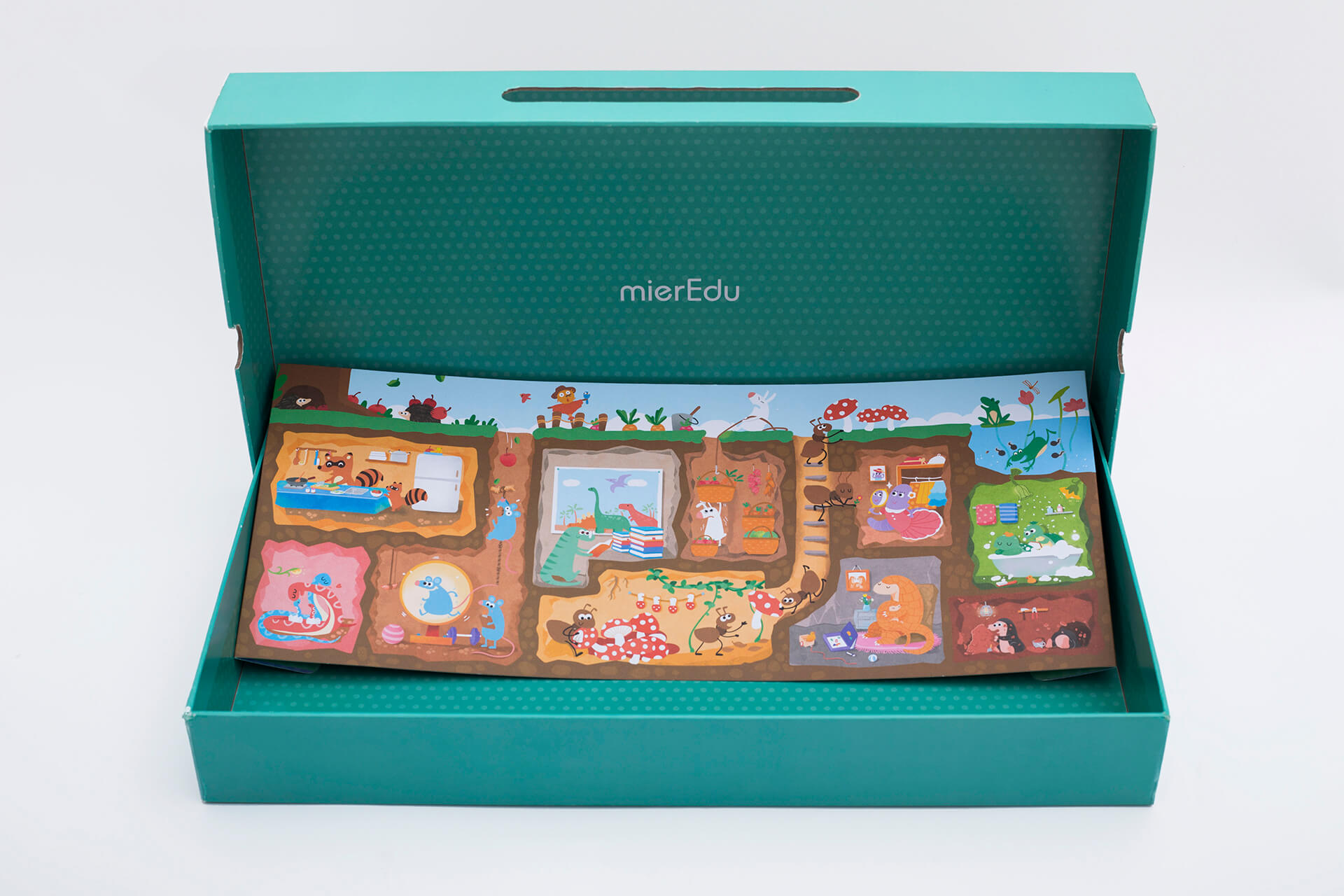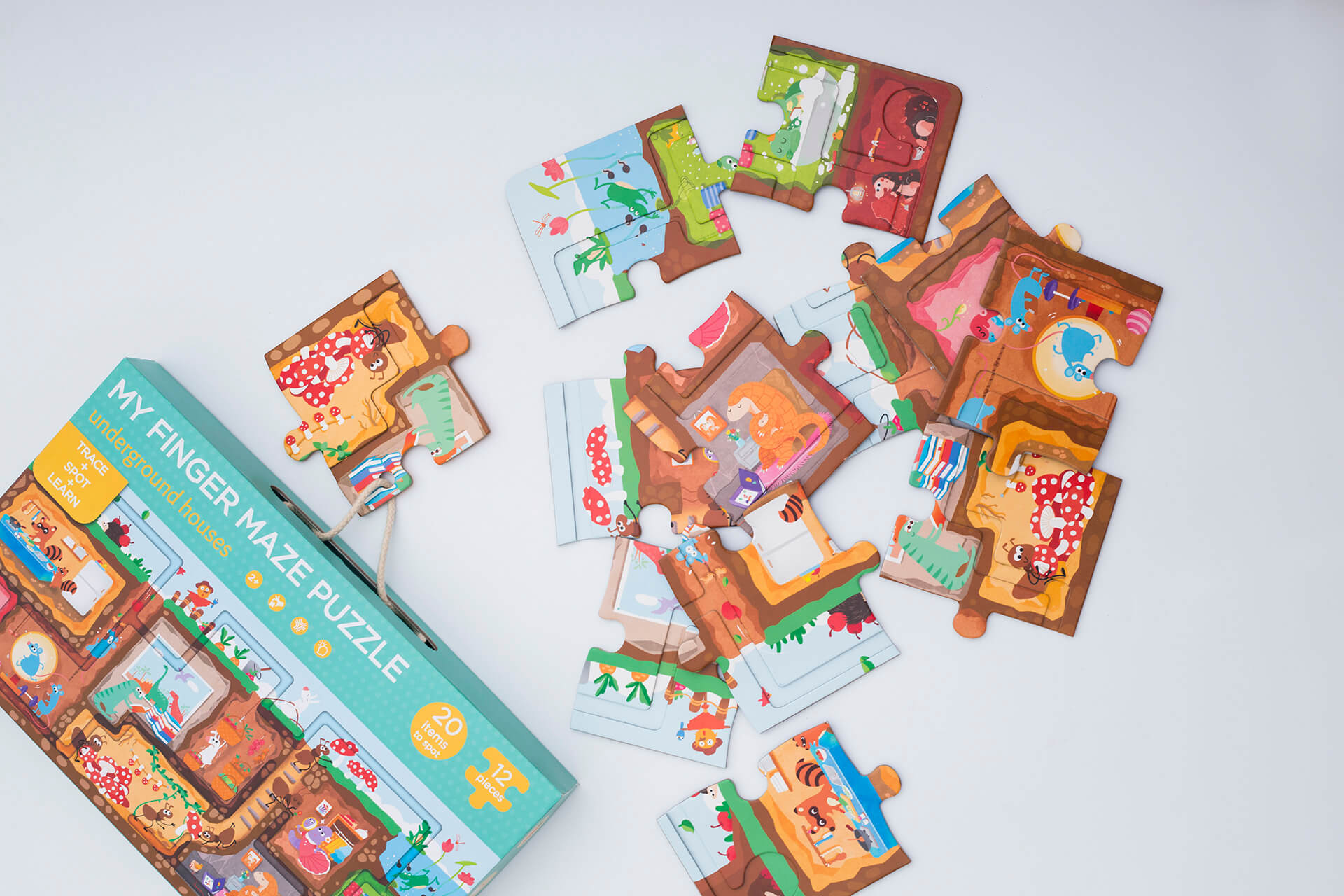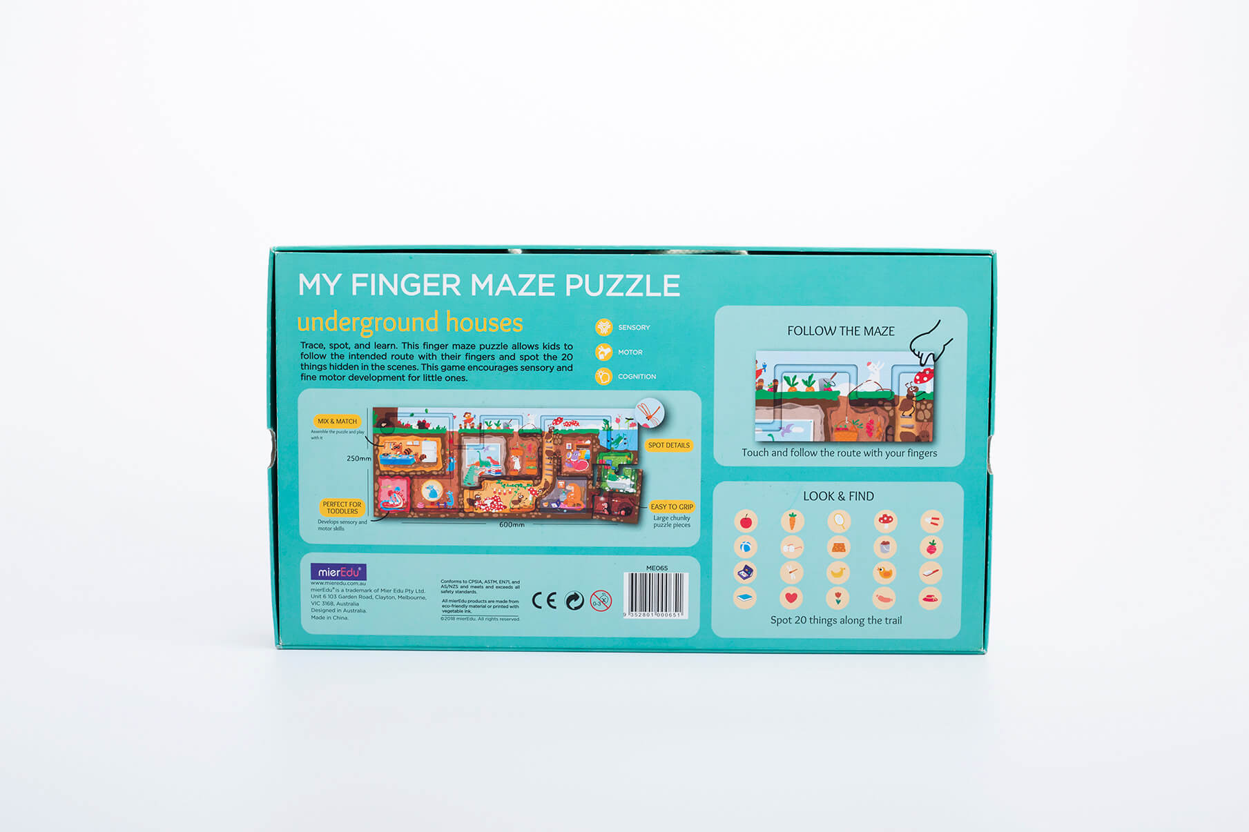 Giv dit barn sjov og læring med mierEdu Kreativt puslespil - Underground Houses, der kombinerer labyrintleg og find-og-søg-aktivitet. Barnet følger labyrinten med fingrene og finder 20 skjulte elementer undervejs, hvilket stimulerer sanser, motorik og kognitiv udvikling på en engagerende måde.