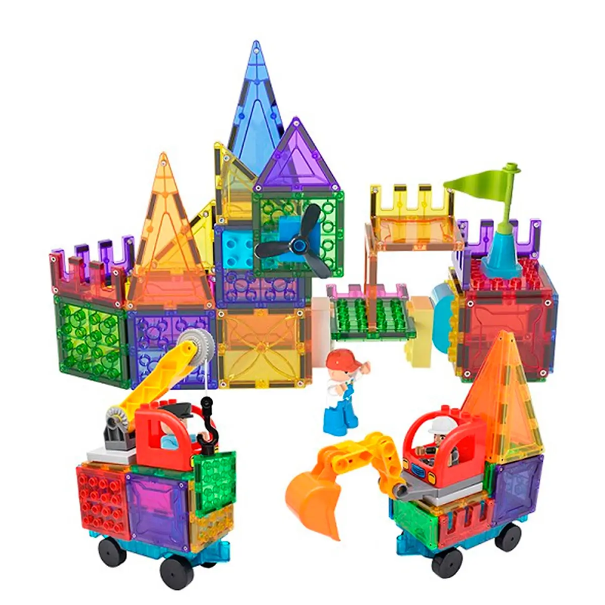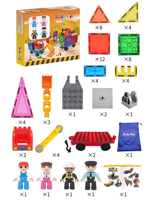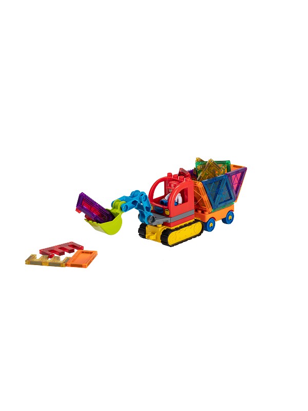 Med Magnetic Tiles Byggeplads sættet får man også 4 figurer, som er med til at gøre legen endnu sjovere. Derudover følger der dele med, så det er muligt at bygge en kran og gravko, så der rigtig kan komme gang i byggepladsen.