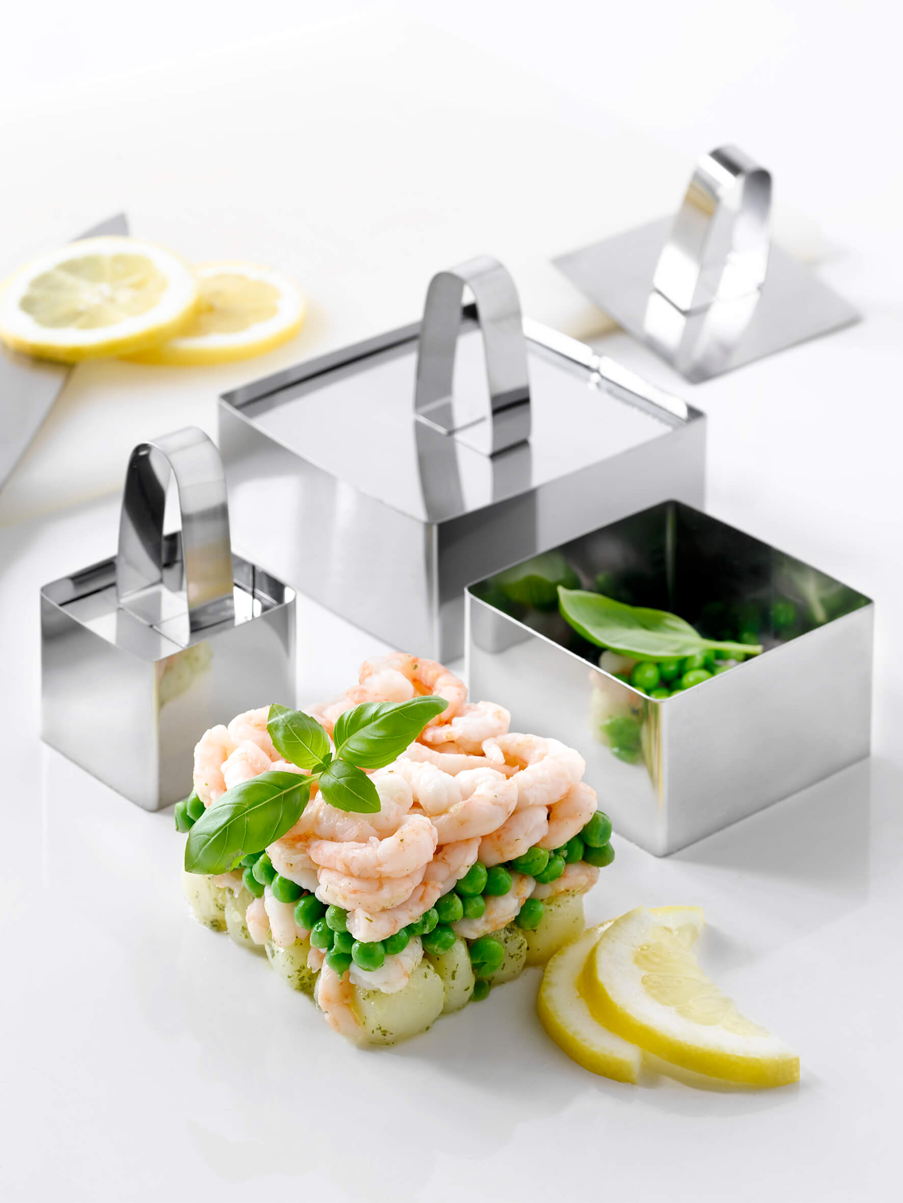 Med dette sæt kvadratiske udstikkerforme får du 9 dele, der gør det nemt at skabe flotte og ensartede former til både mad og bagværk. De polerede stålforme er perfekte til at lave alt fra elegante forretter til dekorative desserter. De tre løftere/presser sikrer, at du kan arbejde med præcision og lethed, uanset om du former dej, mousse eller andet fyld.