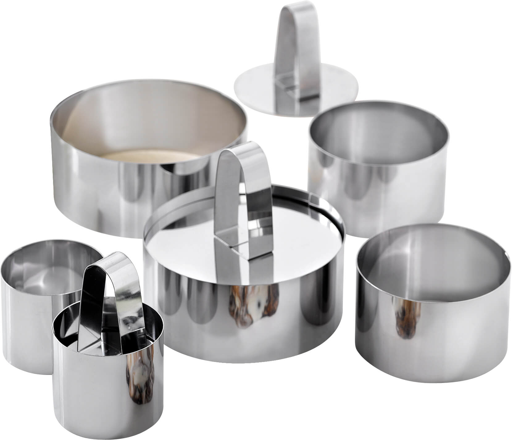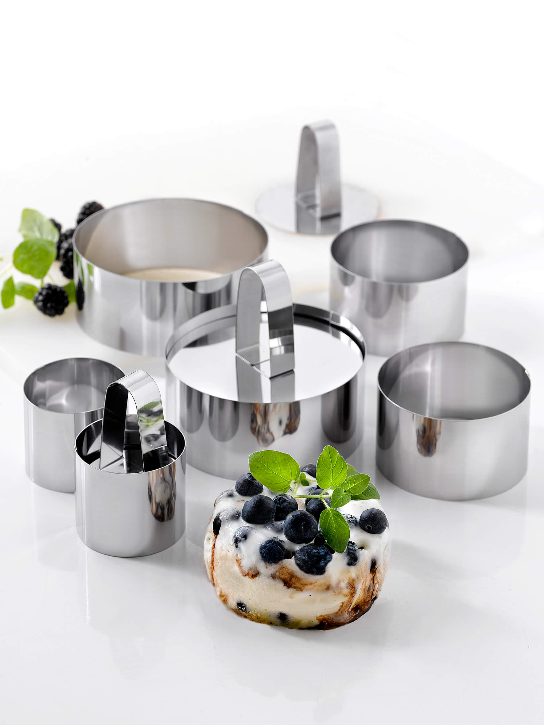 De runde udstikkerforme er perfekte til at forme både varme og kolde retter. Brug dem til at trykke dej, grøntsager eller mousse ud i præcise cirkler, der imponerer ved bordet. Med de medfølgende løftere kan du løfte dine kreationer elegant op uden at miste formen. Det polerede stål giver et flot finish og gør det let at arbejde med både bløde og faste ingredienser.