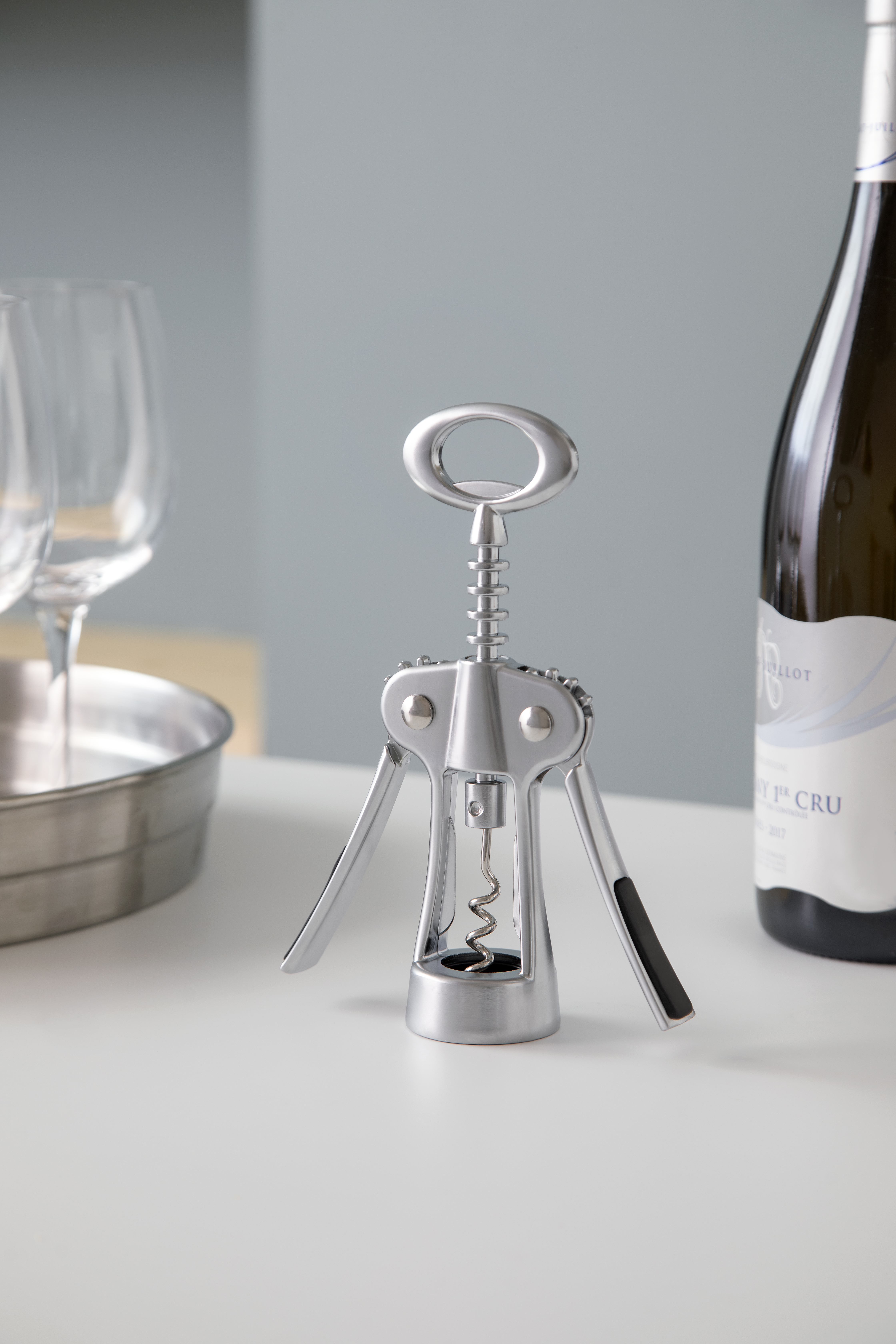 Vingeproptrækkeren kombinerer et klassisk design med moderne materialer for at levere holdbarhed og komfort. Det ergonomiske vingehåndtag med skridsikre flader gør det behageligt at arbejde med, selv når der kræves ekstra kraft. Den præcise skrue i zinklegering glider let ned i korken uden at beskadige den, hvilket sikrer en ren åbning af flasken.