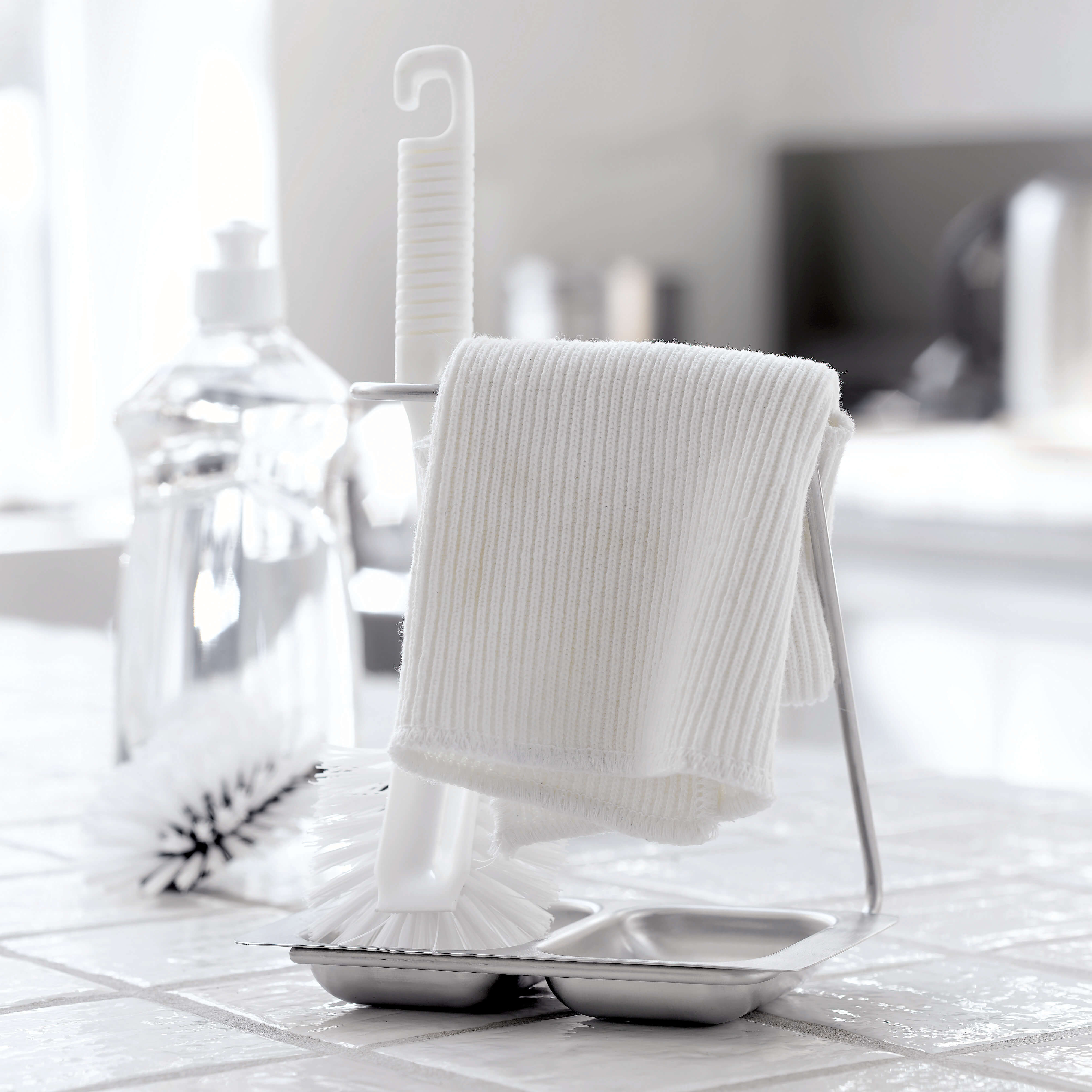Steel-function, 2-rums opvaskebørstestativ samler dine opvaskebørster og klude på en praktisk og pladsbesparende måde. Stativer har to rum i bunden til børster og en holder til at hænge klude til tørre. Det gør opvasken mere organiseret og køkkenbordet ryddeligt.