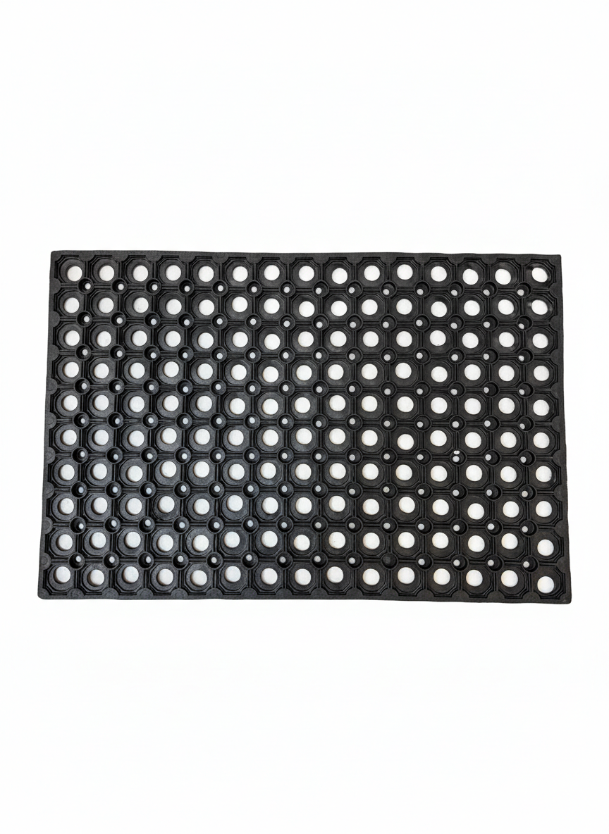 Gummimåtten er fremstillet i slidstærkt materiale, der tåler både varme og væsker uden at tage skade. Dens enkle, sorte design passer ind i de fleste køkkener og arbejdsområder uden at dominere. Den er let at rulle sammen og opbevare, når den ikke er i brug.