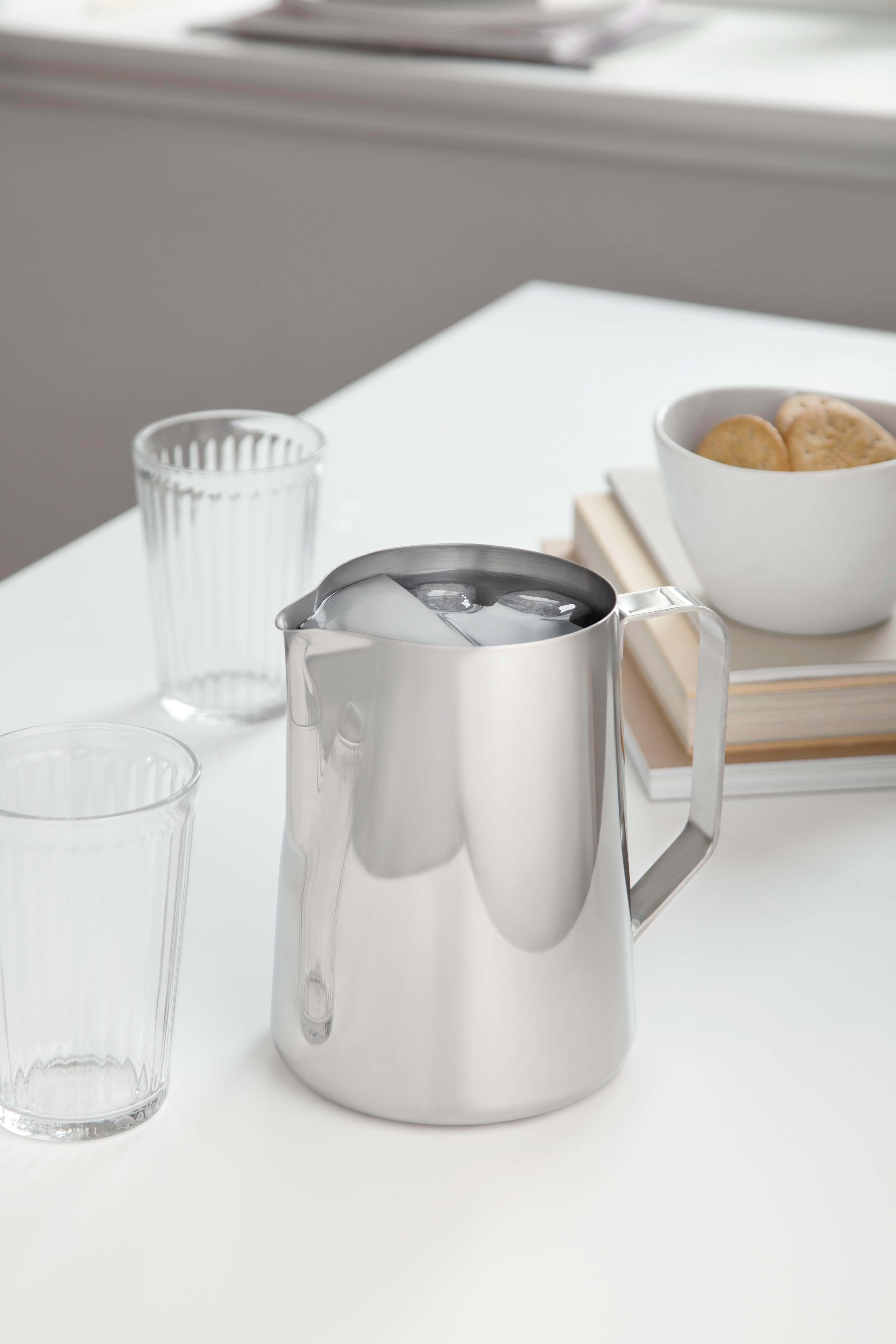 Kandens blanke rustfri stål giver et tidløst og moderne udtryk, der passer til enhver borddækning. Isfanget er diskret integreret og gør det let at hælde uden spild. Den robuste konstruktion sikrer, at kanden kan tåle daglig brug, mens den glatte overflade gør rengøringen enkel og hurtig. En kande, der både imponerer visuelt og letter serveringen.