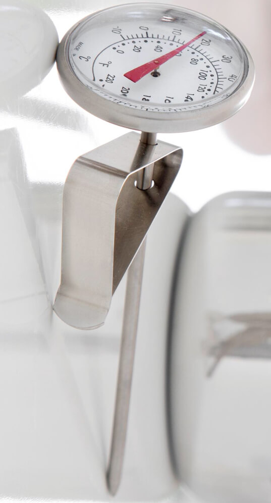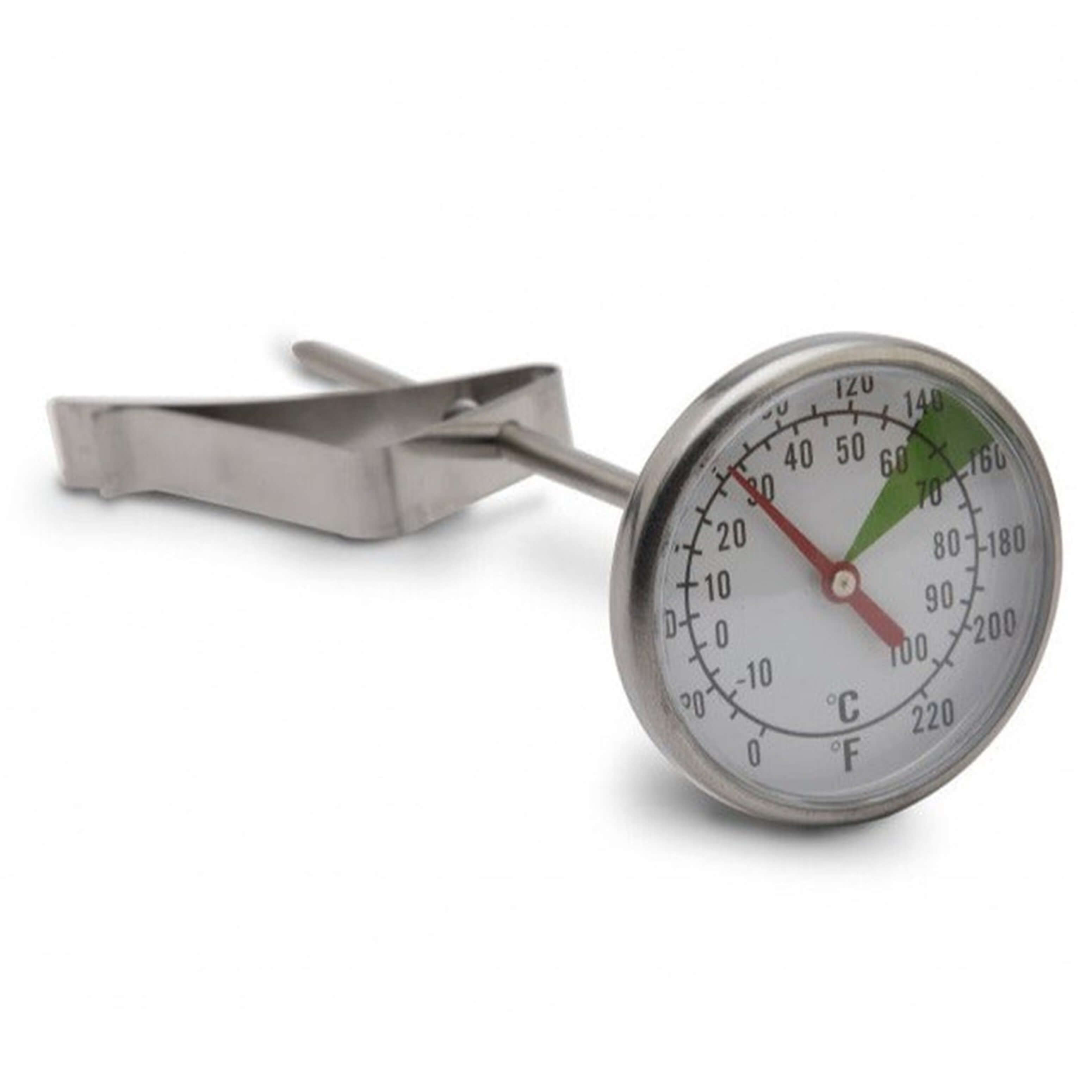 Steel-function, barista mælketermometer hjælper dig med at opnå den ideelle temperatur på mælken til din cappuccino eller latte. Med en praktisk clips kan termometeret fastgøres sikkert på kanden, så du nemt kan følge med under opvarmningen. Det sikrer, at mælken hver gang får den rette temperatur, hvilket er afgørende for et cremet og lækkert skum.
