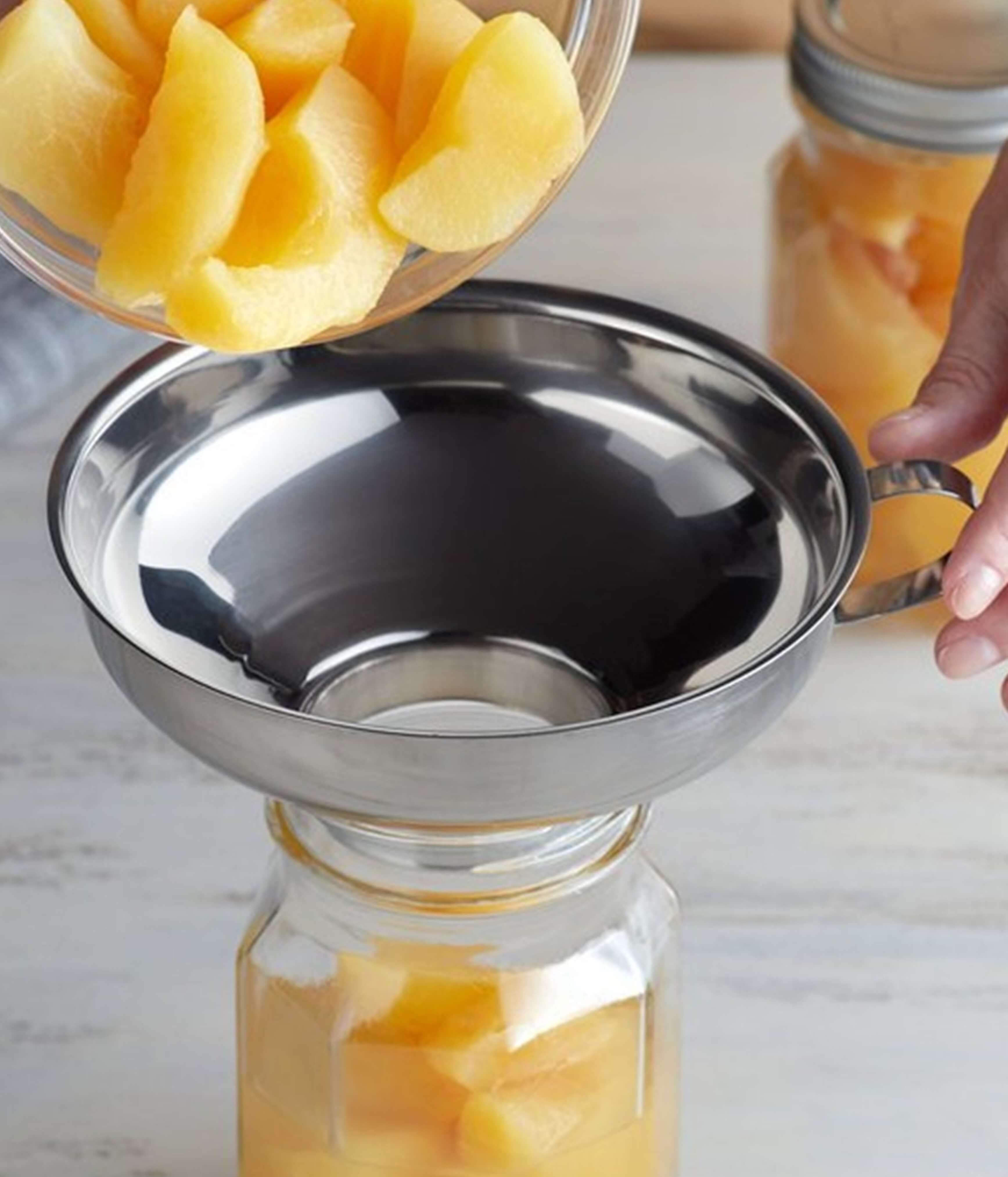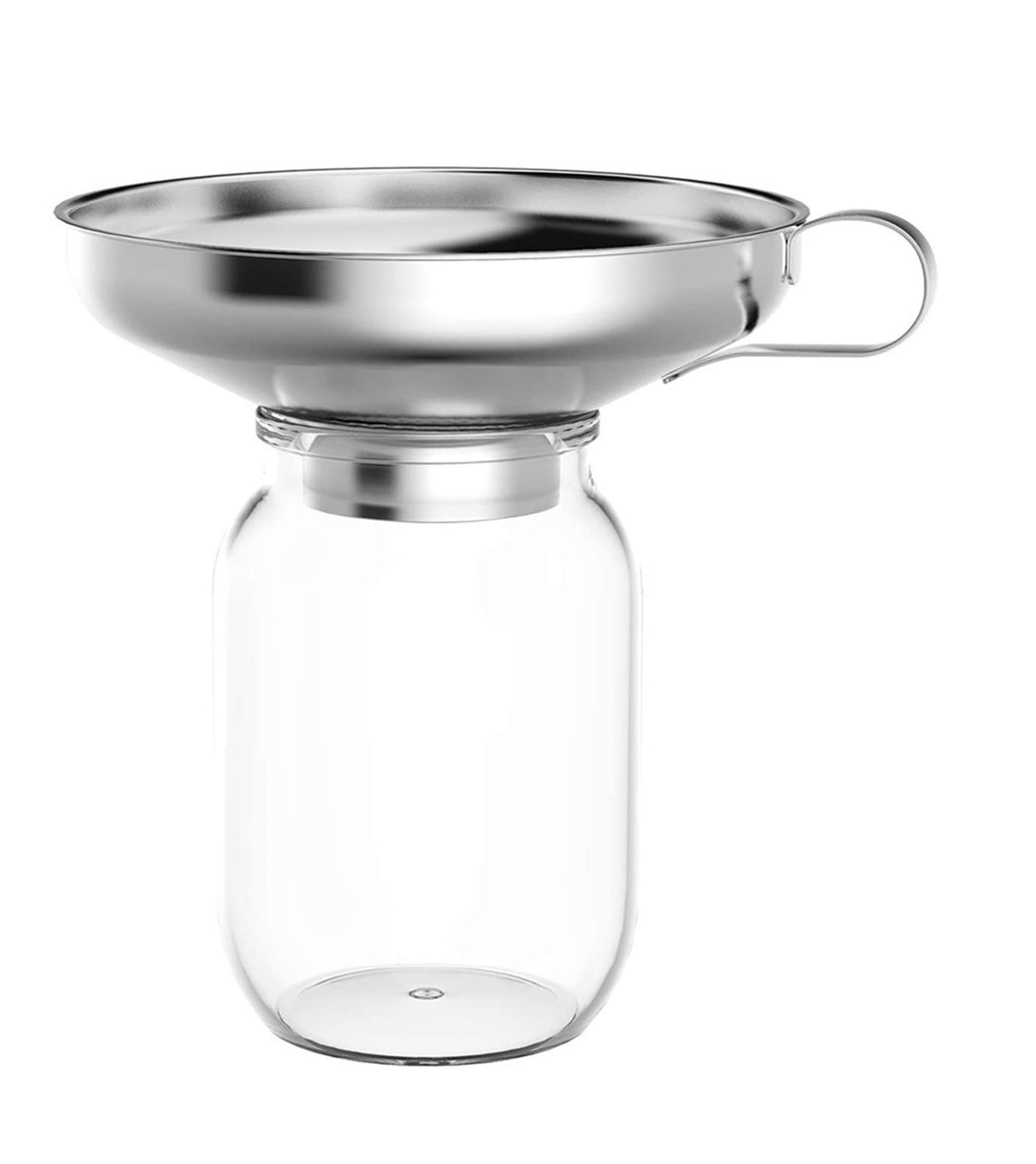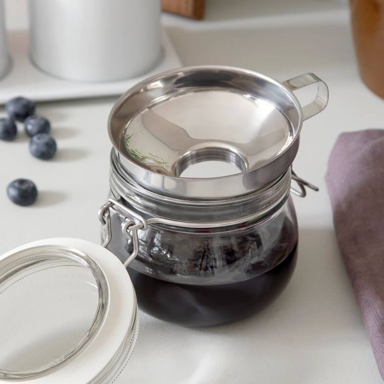 En robust tragt i rustfrit stål, der gør påfyldning af syltetøj, olie og krydderier til en leg. Med sin smalle åbning sikrer den præcis hældning uden spild, og den kompakte størrelse passer perfekt til mindre beholdere og glas.