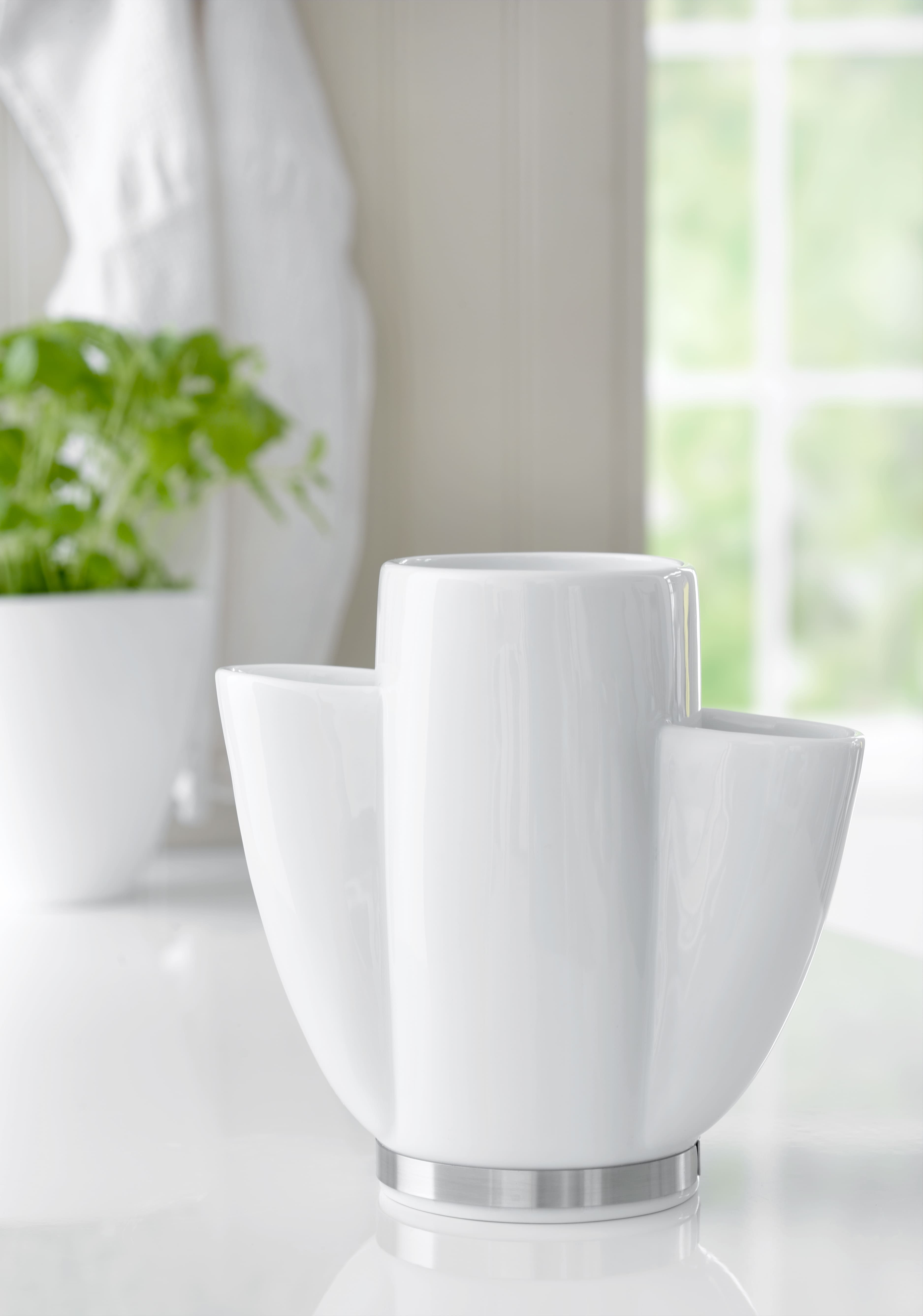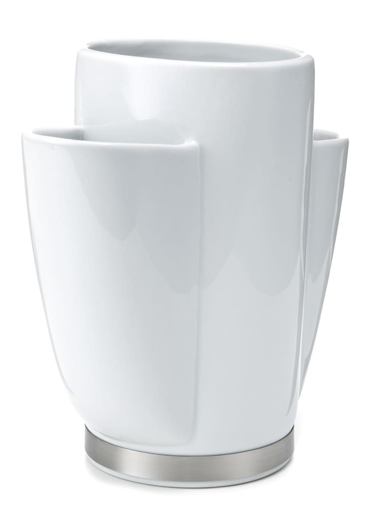 Den tredelte opdeling giver mulighed for at sortere redskaber efter type, hvilket gør det nemt at holde orden. Porcelænet sikrer en glat og let rengøringsvenlig overflade, mens den rustfri stålkant i bunden tilfører et moderne touch og stabilitet. Holderen passer perfekt til både træske, piskeris og små redskaber.