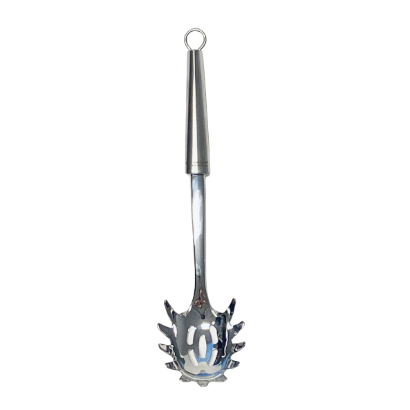 Det særlige håndtag er designet til at give et sikkert og behageligt greb, så du nemt kan løfte og servere uden at maden glider af. Den smarte form gør det også lettere at få fat i de lange pastaer eller andre retter, der kan være svære at håndtere med en almindelig ske.