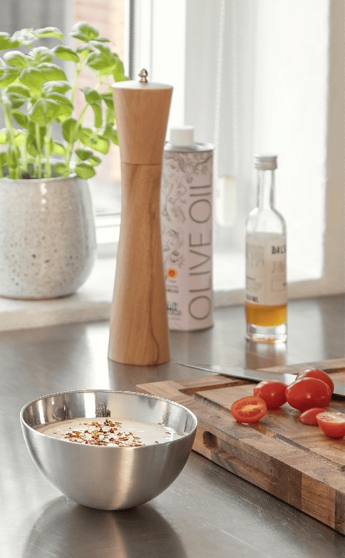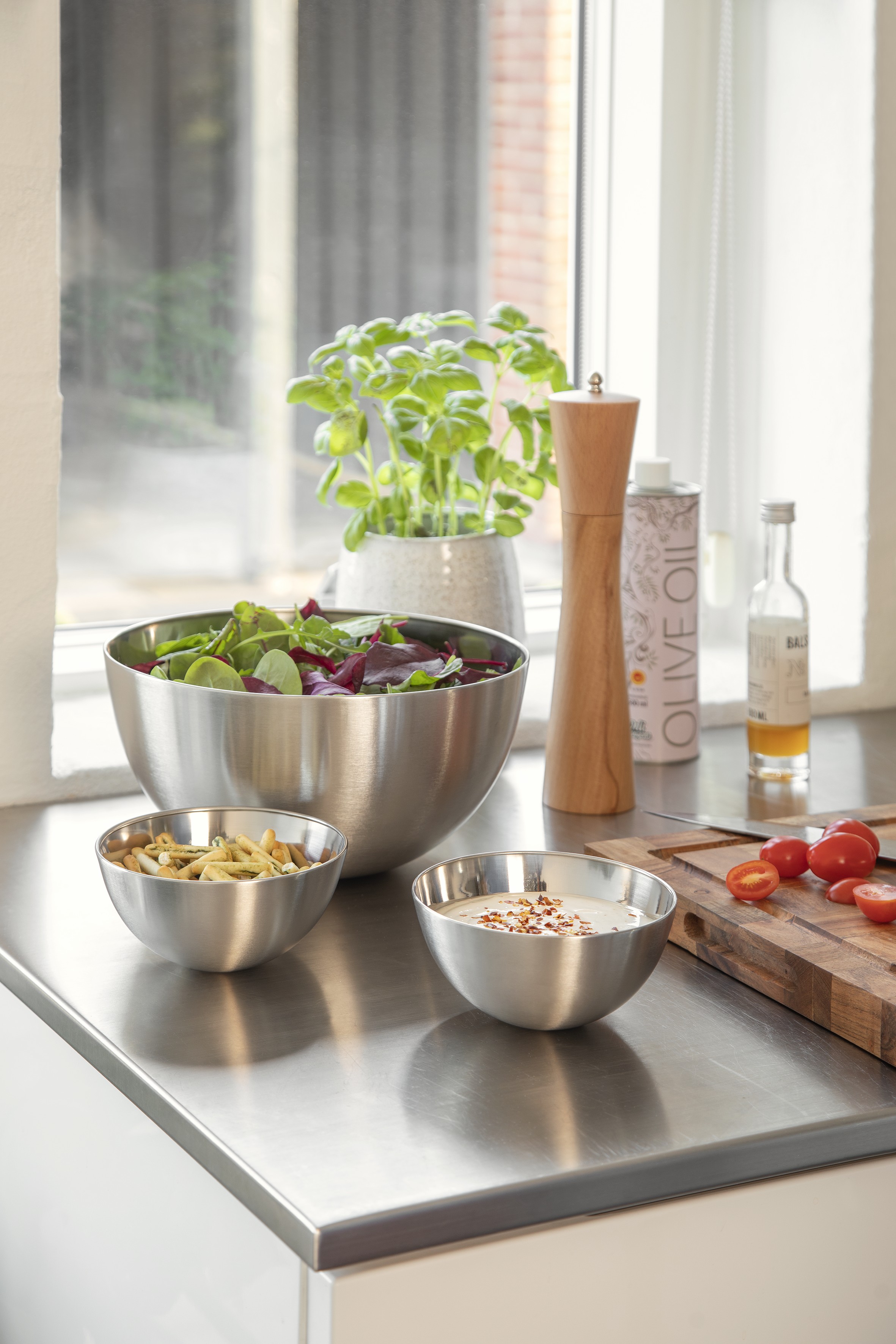 Skålen har en mat yderside, der giver et diskret og stilrent look, mens den blanke inderside sikrer nem rengøring og en flot præsentation af indholdet. Det rustfri stål gør skålen holdbar og modstandsdygtig over for daglig brug, og den kompakte størrelse gør den ideel til både hverdag og særlige lejligheder.