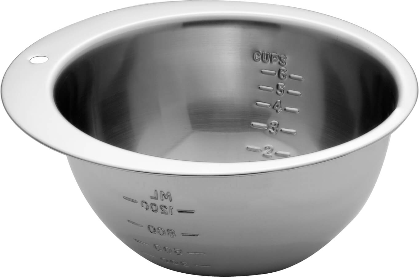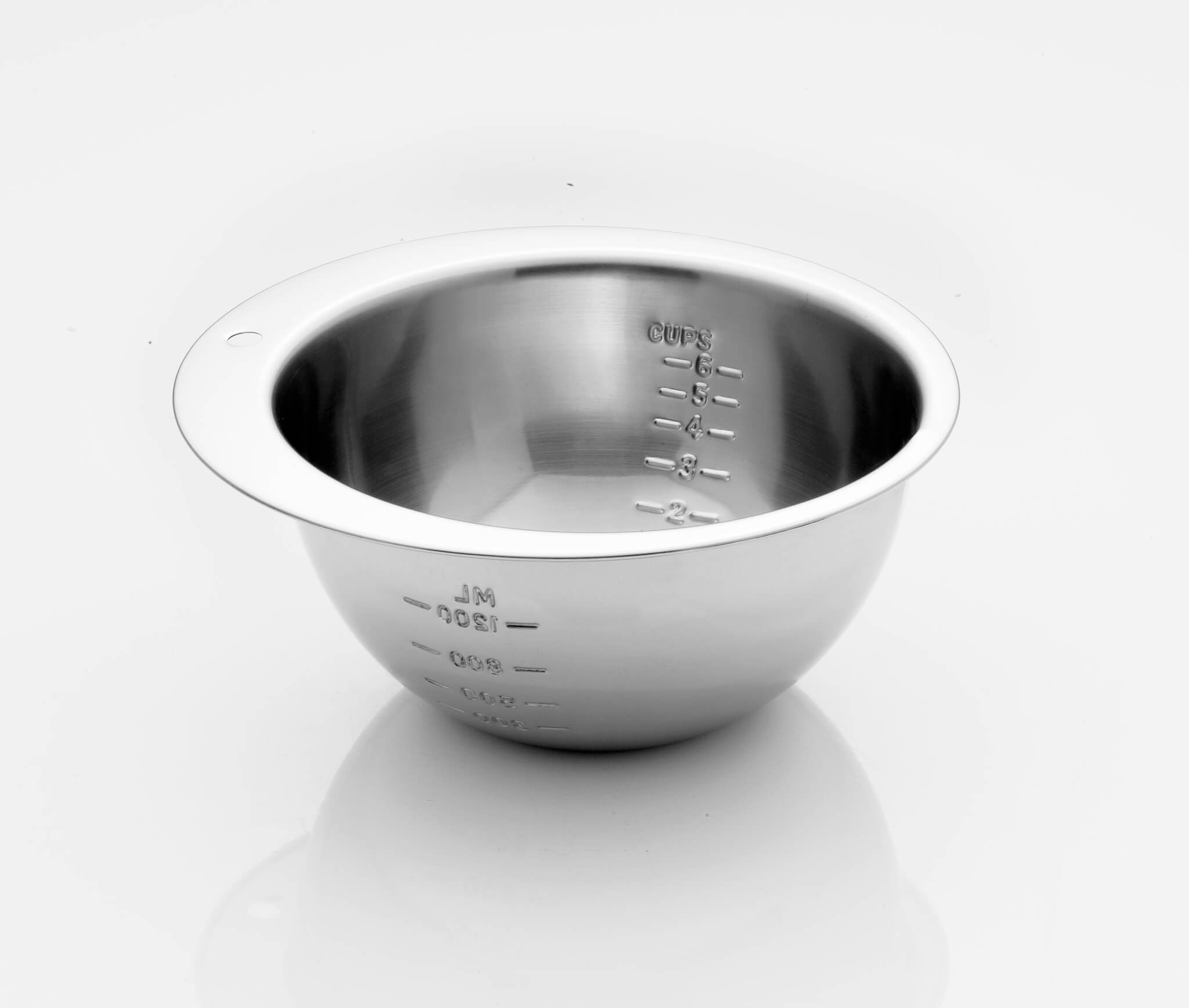 Skålen er fremstillet i robust rustfrit stål, som sikrer holdbarhed og nem rengøring. Den glatte overflade modvirker, at ingredienser hænger fast, og målene på indersiden gør det let at dosere uden ekstra redskaber. Den brede kant sikrer et godt greb, så du kan piske og blande uden besvær.