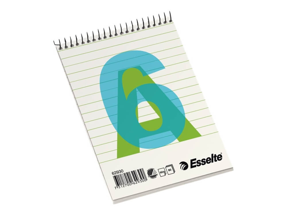 Ekstra information Esselte blok A6 med topspiral og uden huller. Den ideelle blok til journalisten eller håndværkeren på farten.
