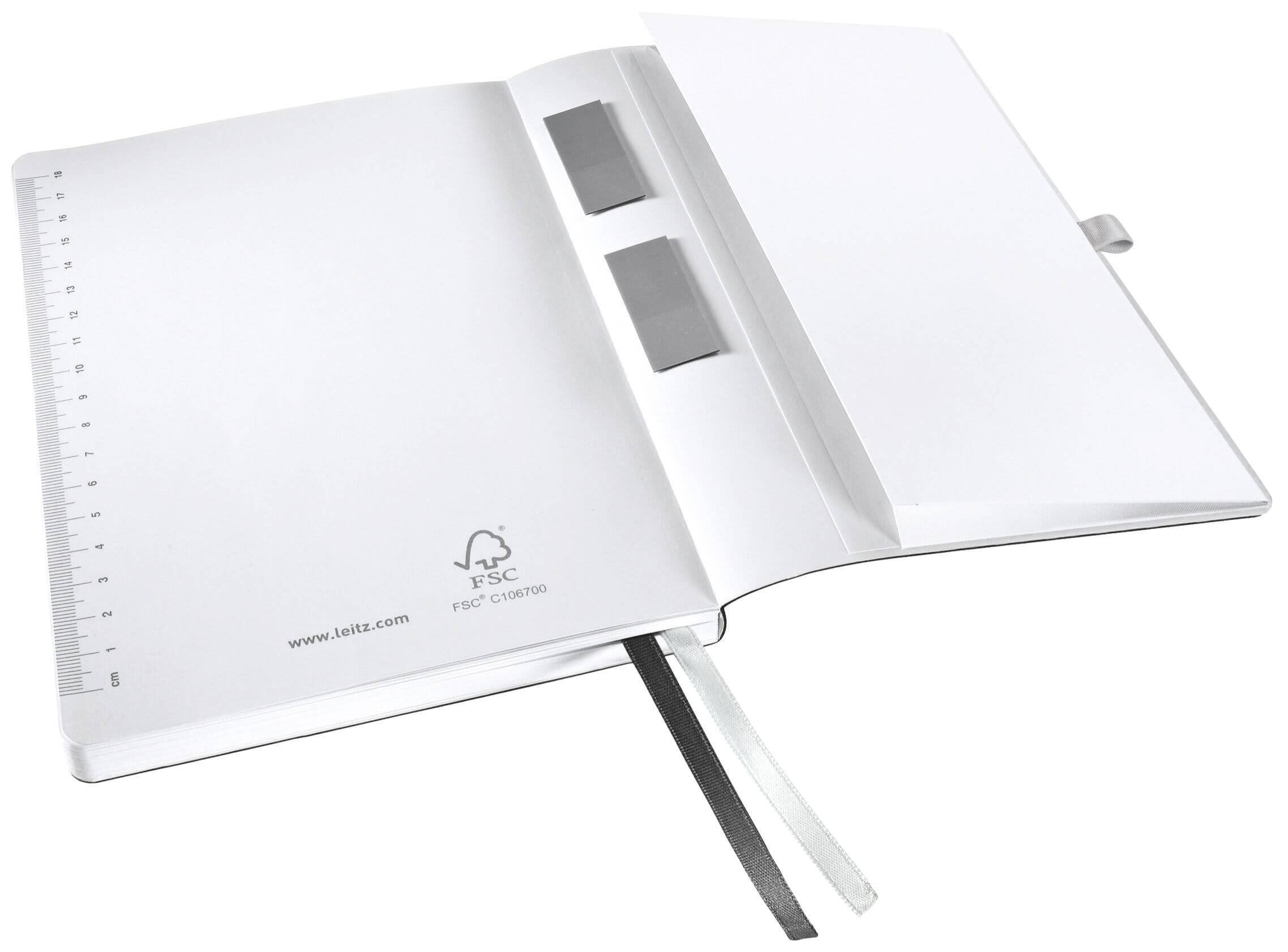 | Ekstra information | Notesbog i Leitz Premium quality. Udsøgt moderne design til notes-tagning i hverdagen, med attraktive blødt børstet look.Specielle egenskaber sikrer optimal organisering af dine noter.- Attraktiv sølvfarvet elastiklukning holder løse papirer sikkert på plads- Penneholder holder altid pennen lige ved hånden- Med 2 tekstil sidedelere/bogmærker til hjælp til at finde vigtige sider hurtigt |