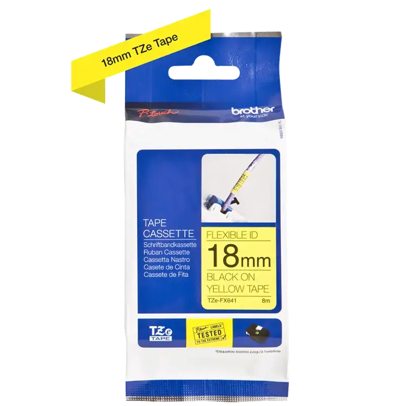 Vælg Brother TZe tape 18 mm x 8 m flexible black / yellow for en pålidelig og synlig mærkningsløsning, der klarer selv krævende opgaver med lethed.