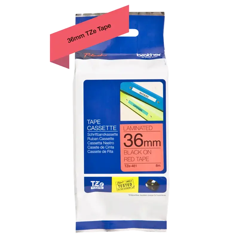 Vælg Brother TZe tape 36 mm x 8 m black / red for at sikre skarpe, holdbare og professionelle labels, der gør organiseringen nem og overskuelig.