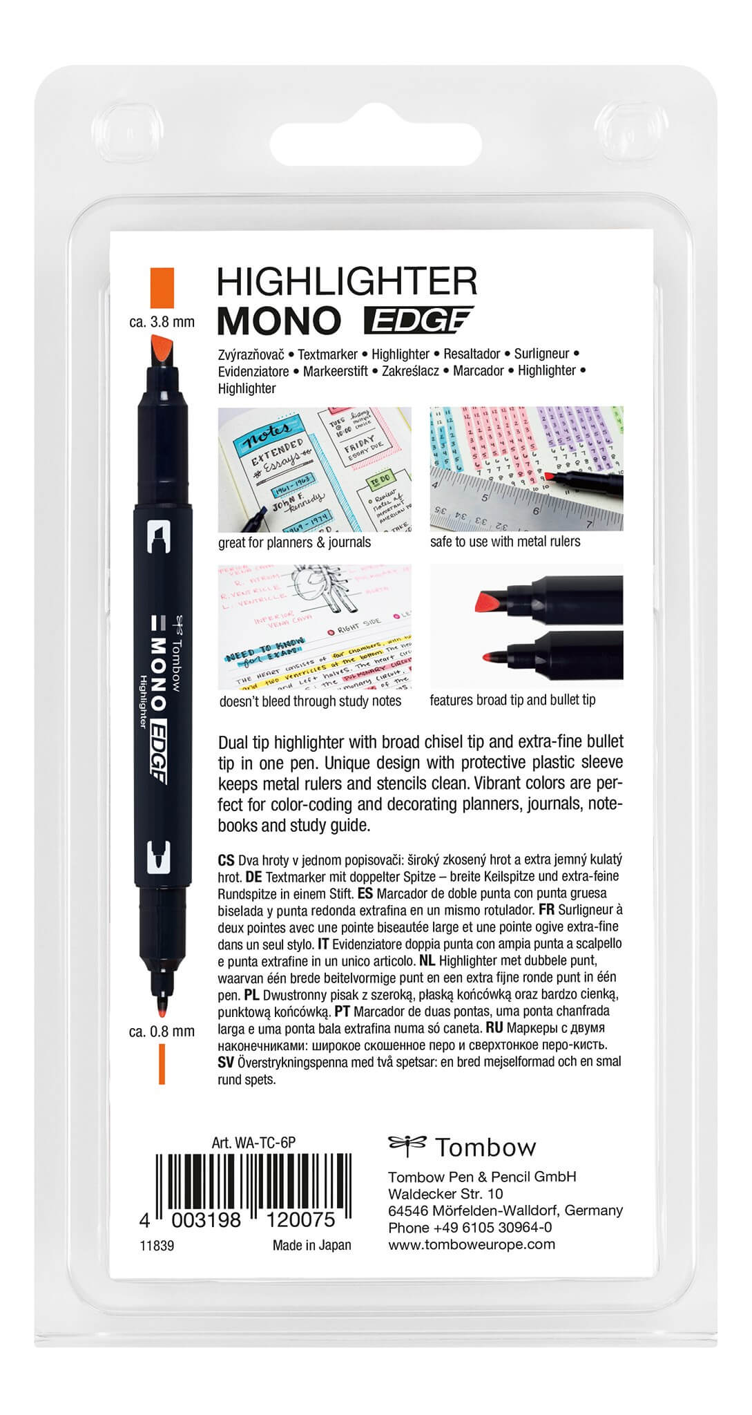Tombow MONO Edge overstregningspenne er designet til at give dig præcis og alsidig markering i dine noter og dokumenter. Sættet indeholder 6 farverige overstregningspenne, hver med en dobbeltspids, der gør det nemt at skifte mellem en bred og en smal streg. Det betyder, at du både kan fremhæve store tekststykker og lave detaljerede understregninger med samme pen. Farverne er klare og holdbare, hvilket sikrer, at dine markeringer forbliver tydelige og flotte over tid.