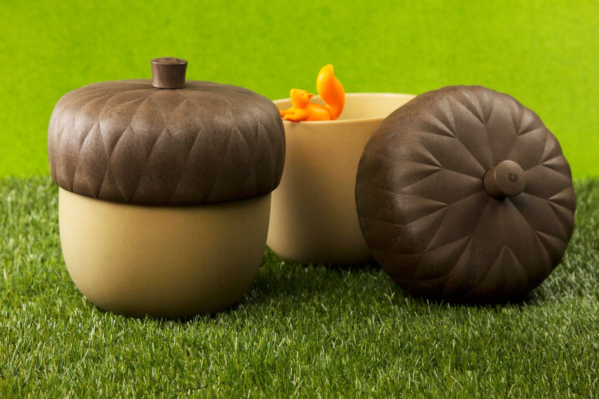 - Design: Inspireret af et agern med låg formet som et egern