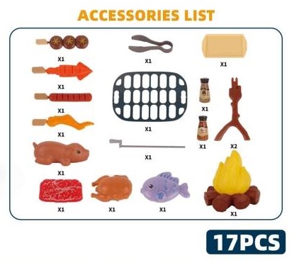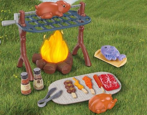 Medfølgende tilbehør: Inkluderer 17 dele med grill, grillspyd, fisk, kød, pølser, tang, bakke, krydderier og mere, så børn kan lave deres egen lejrmad.