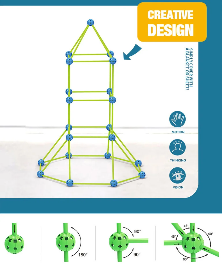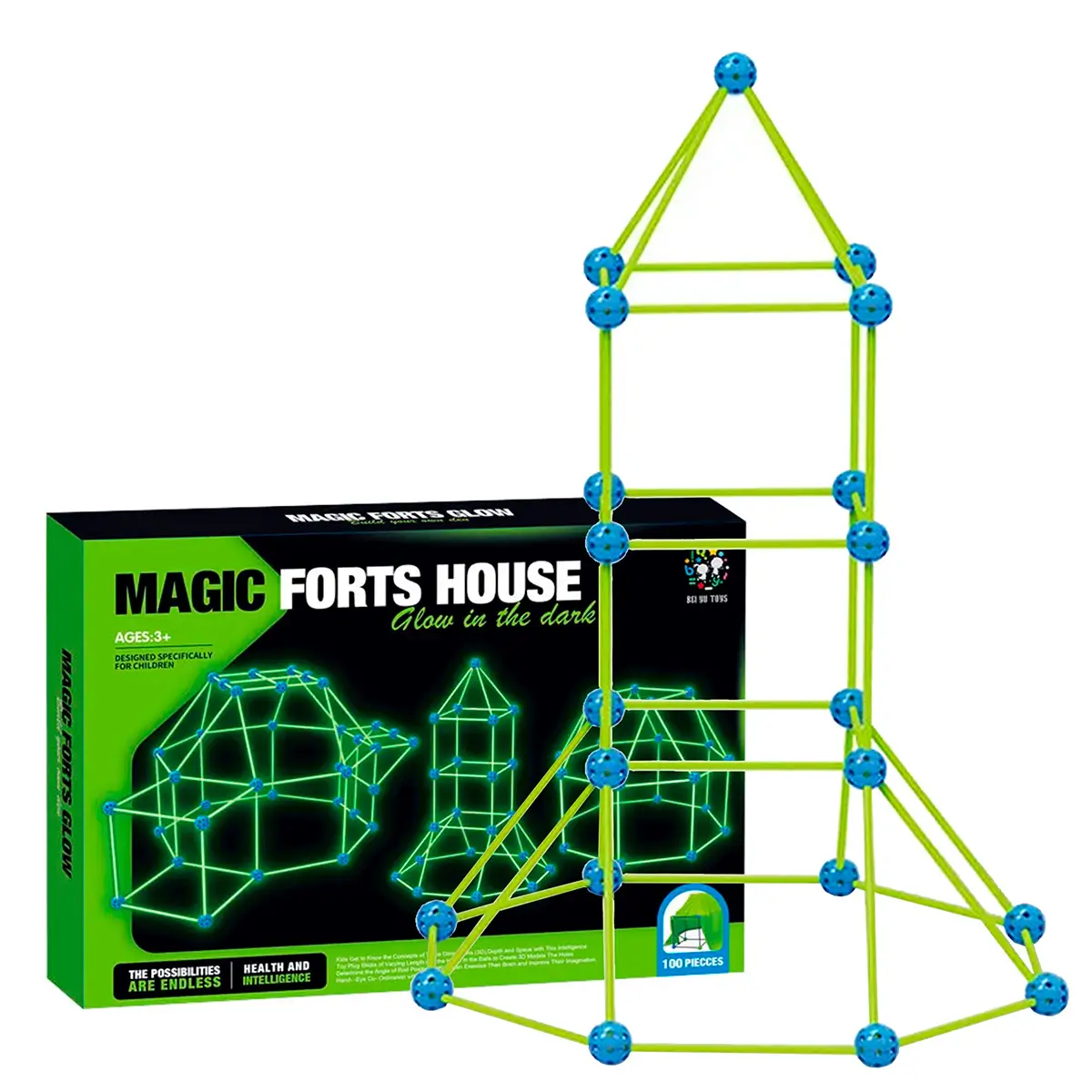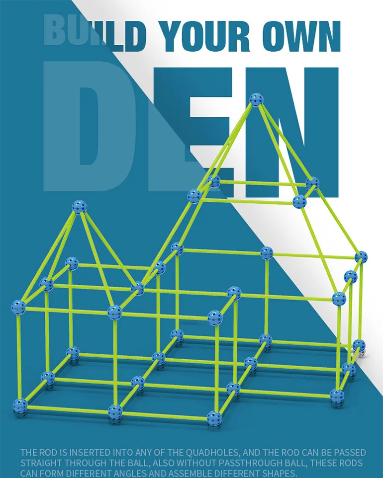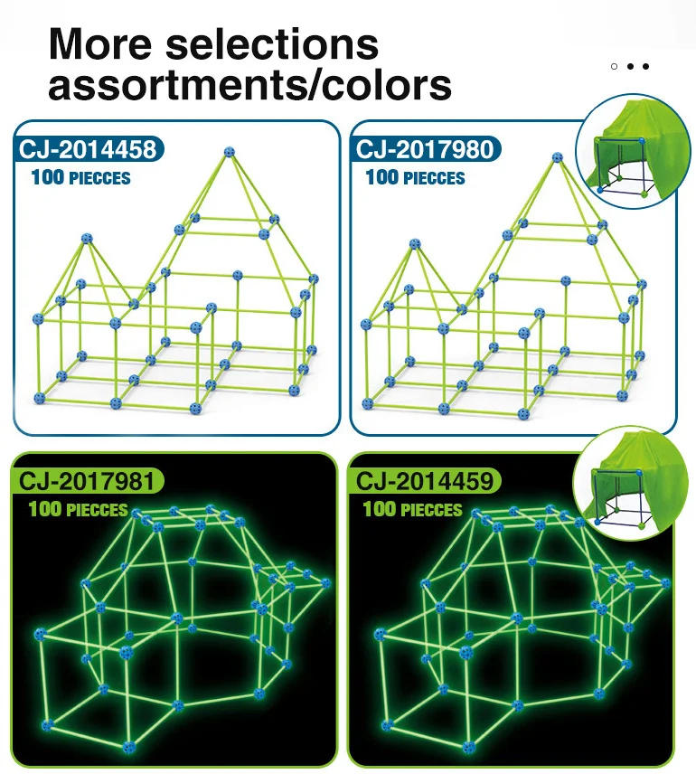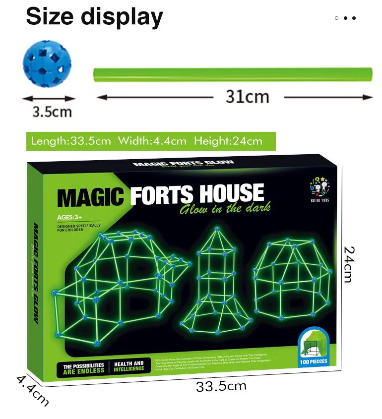 Slip fantasien løs og byg din helt egen selvlysende hule! Dette byggesæt med 100 dele og et medfølgende tæppe er perfekt til børn, der elsker at konstruere og lege i deres egne rum. Delene lyser i mørke og kan samles til mange forskellige former – fra kupler til raketter og hytter. Kast tæppet over konstruktionen og skab den sejeste hule i stuen eller børneværelset.